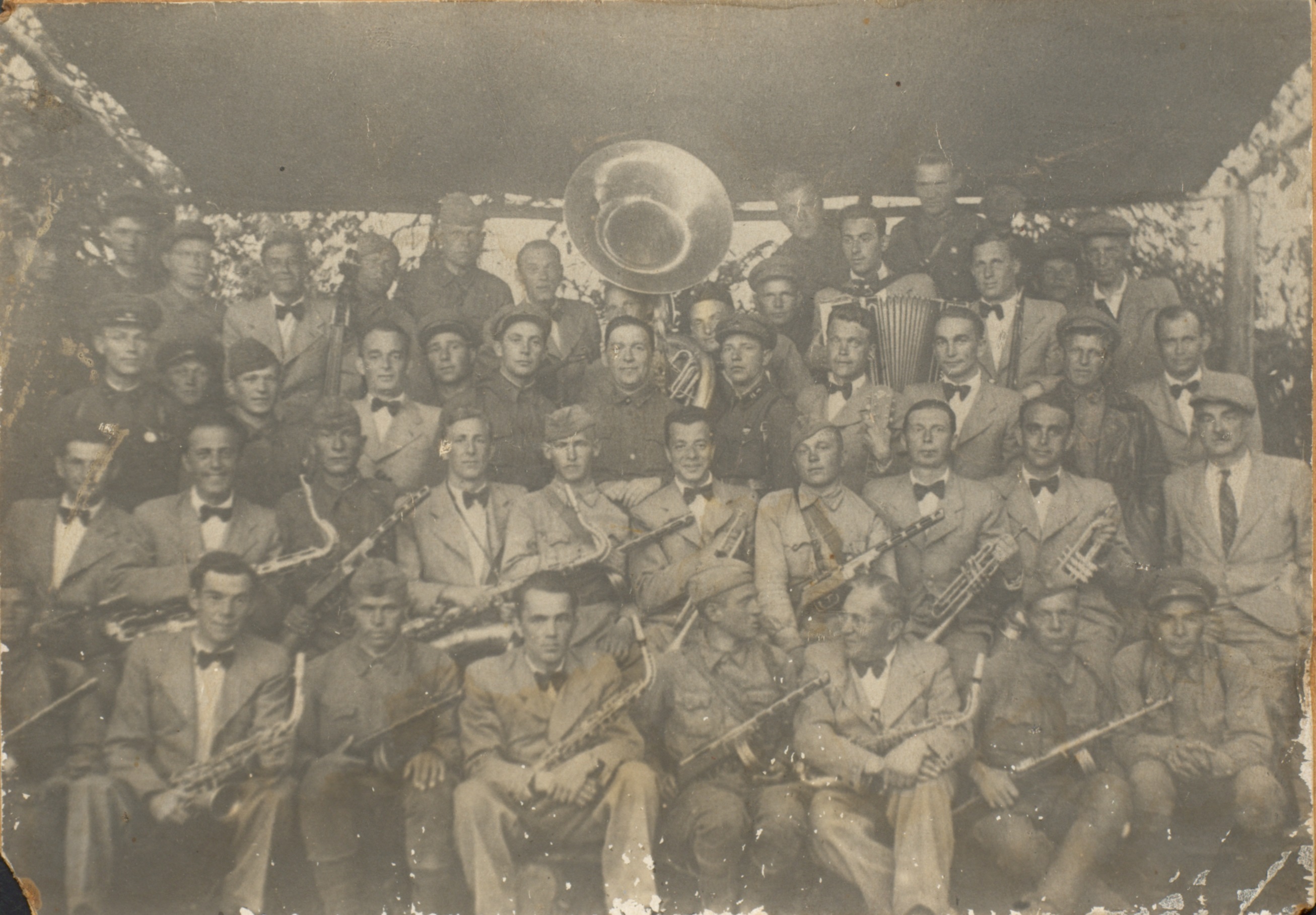 Фотография музыкантов джаз-оркестра Л.О. Утесова на Калининском фронте с солдатами и офицерами РККА. Л.О. Утесов – третий справа в первом ряду. [1942 г.] Ф. 3005. Оп. 1. Ед. хр. 1149. Л. 1