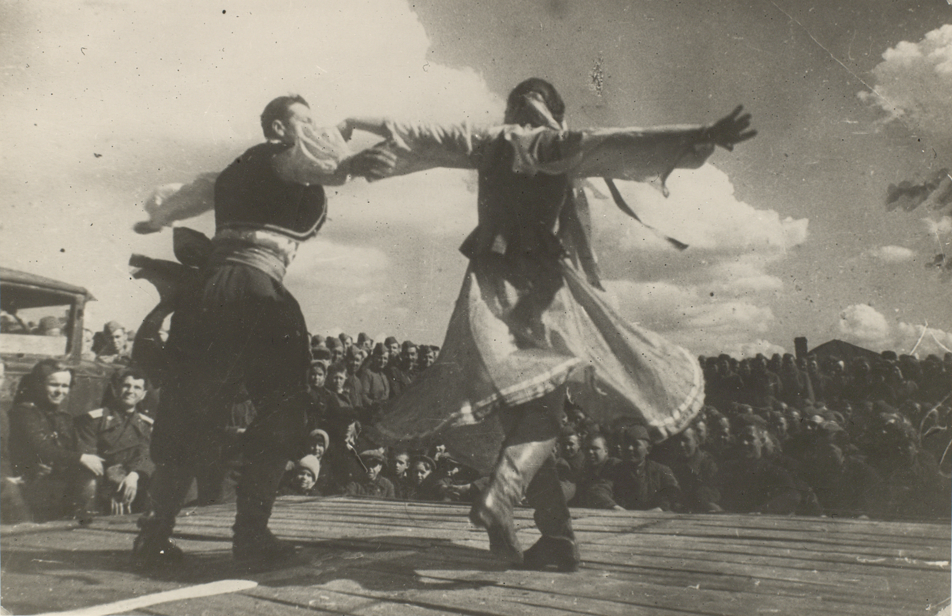 Фотография выступления артистов балета ГАБТ Б.С. Холфина и М.В. Дамаевой на фронте. 1943 г. Ф. 2932. Оп. 3. Ед. хр. 424. Л. 1