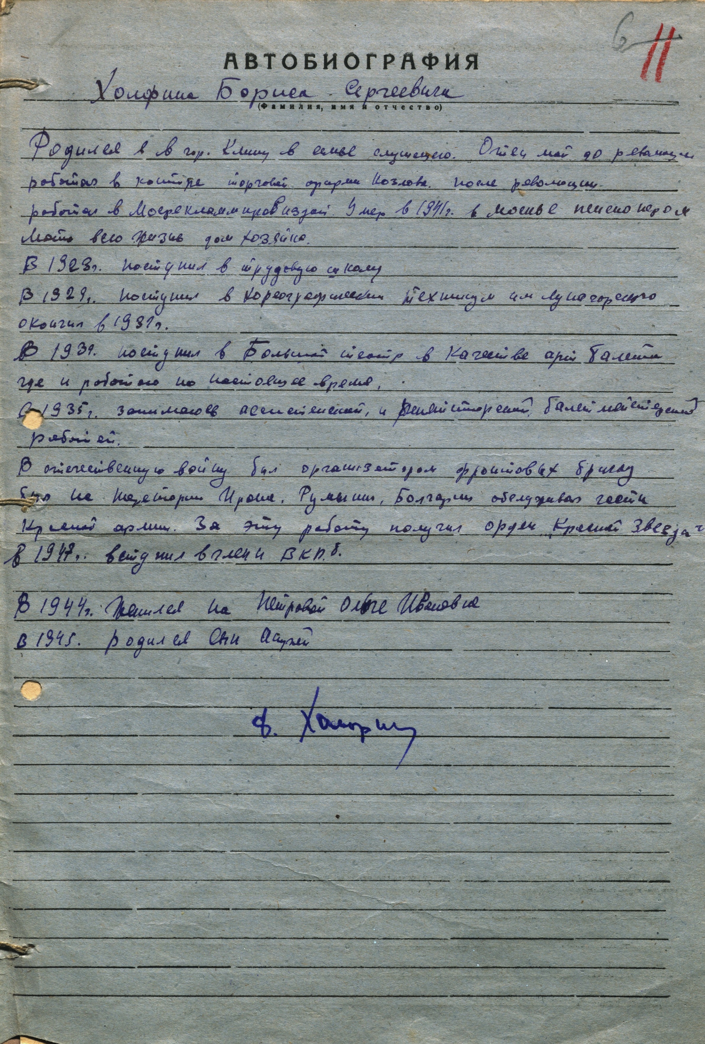 Автобиография Б.С. Холфина. Вторая половина 1940-х гг. Рукопись. Ф. 648. Оп. 6. Ед. хр. 1401. Л. 6