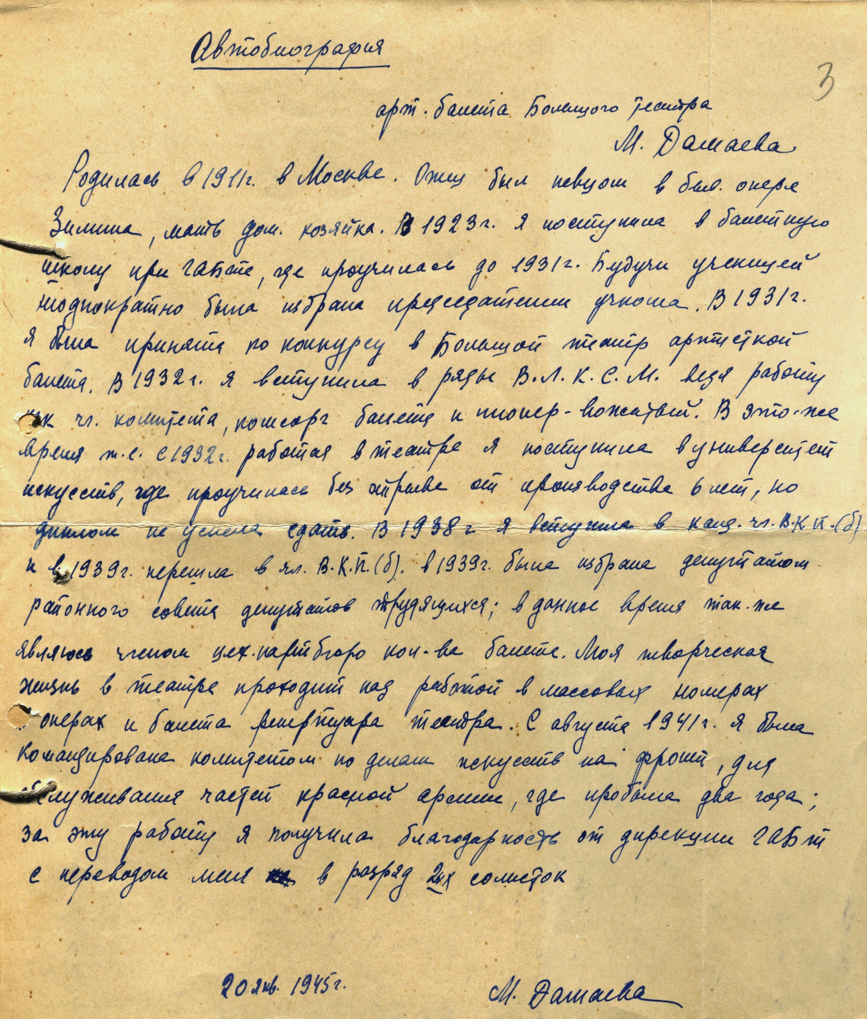 Автобиография М.В. Дамаевой. 20 января 1945 г. Рукопись. Ф. 648. Оп. 13. Ед. хр. 196. Л. 3