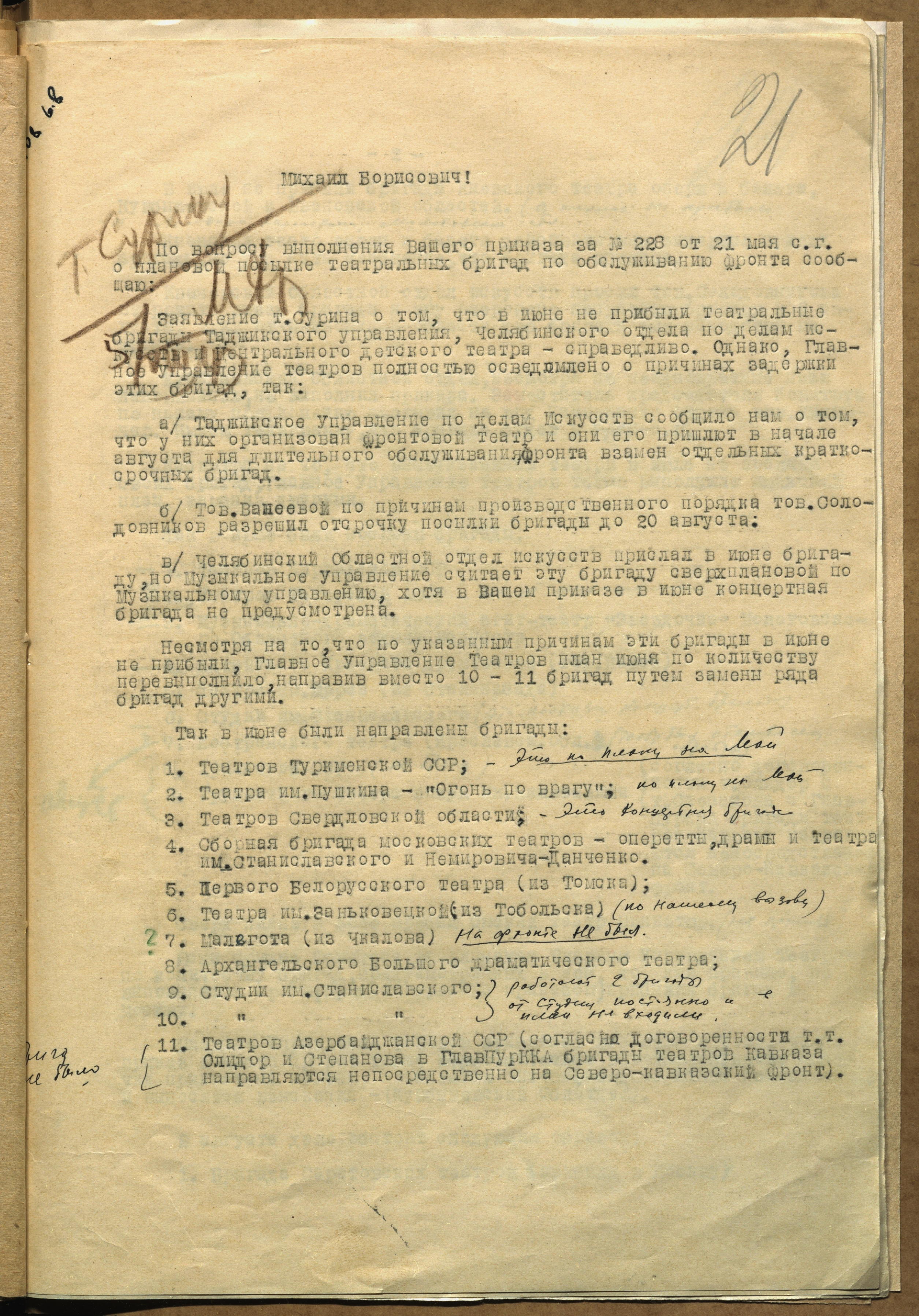 Письмо начальнику Главного управления музыкальными учреждениями КПДИ при СНК СССР В.Н. Сурина М.Б. Храпченко о срыве некоторыми региональными управлениями по делам искусств сроков отправки театральных бригад. 29 июня 1943 г. (Резолюция Б.М. Храпченко В.Н. Сурину от 30 июля 1943 г.: «Свяжитесь с этими организациями. Работников, злостно срывающих план – надо наказать» ). Машинопись. Ф. 962. Оп. 5. Ед. хр. 692. Л. 24