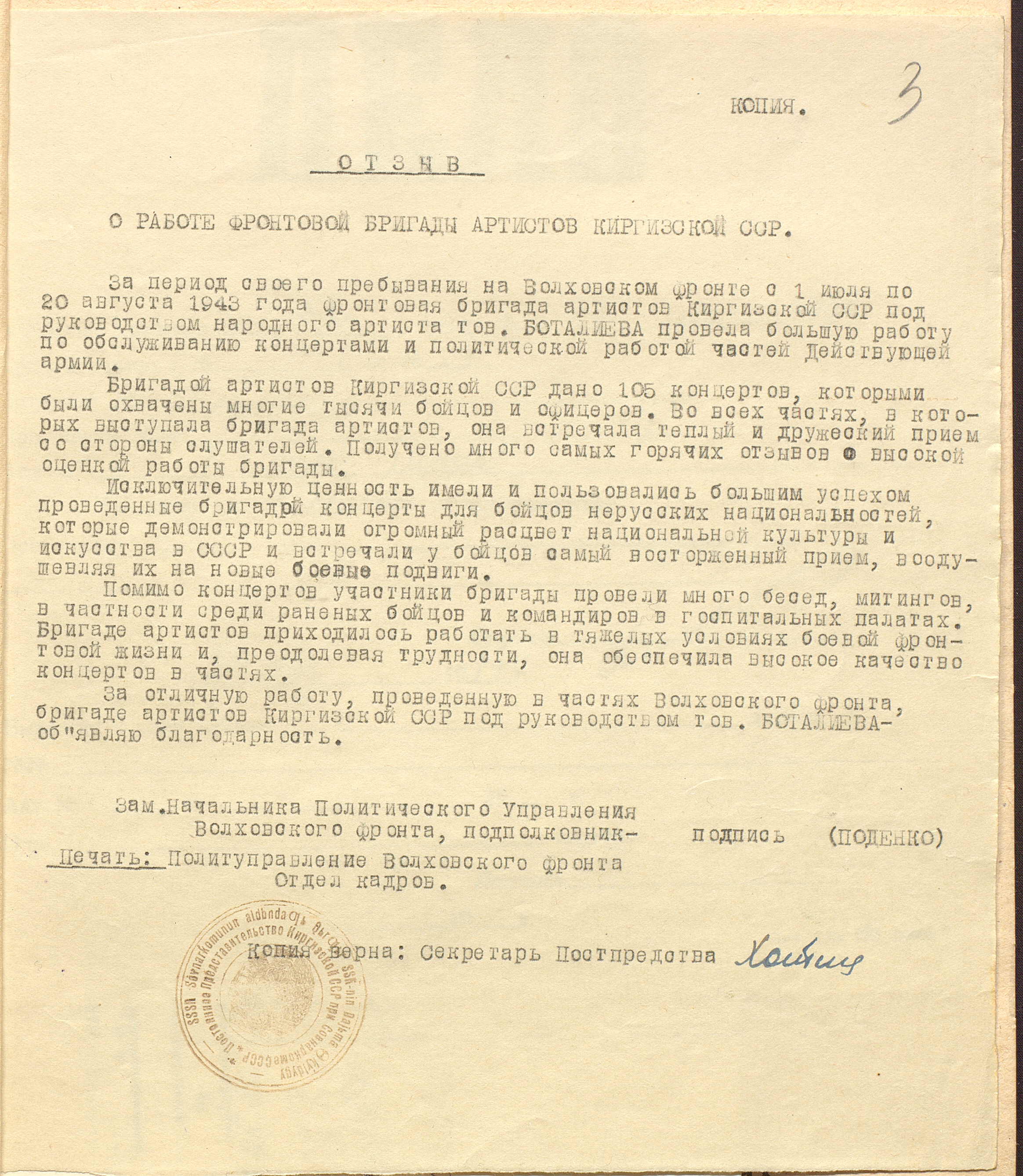 Отзыв заместителя начальника Политуправления Волховского фронта подполковника П.Ф. Поденко о работе фронтовой бригады артистов Киргизской ССР. [Август] 1943 г. Машинописная копия. Ф. 970. Оп. 17. Ед. хр. 62. Л. 3