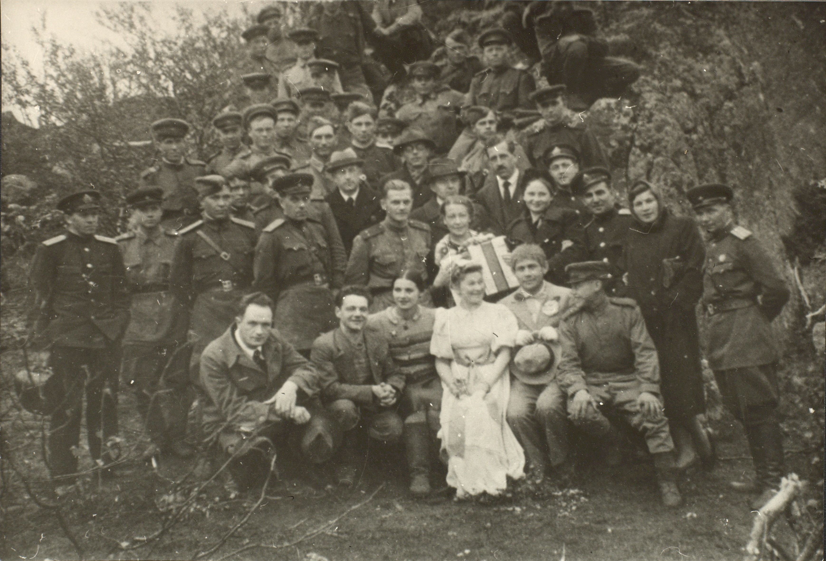 Фотография концертной бригады Московской государственной консерватории с бойцами Н-ской части в районе Берлина. Бригадир – профессор Я.И. Рабинович (крайний справа в первом ряду). [Май] 1945 г. Ф. 2932. Оп. 3. Ед. хр. 430. Л. 1