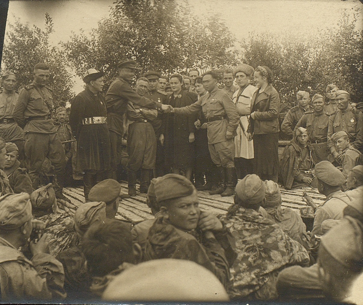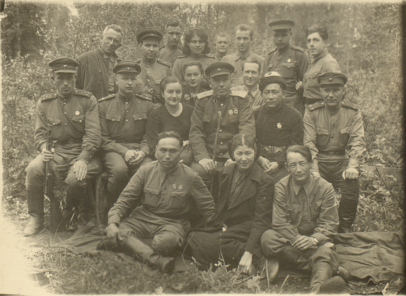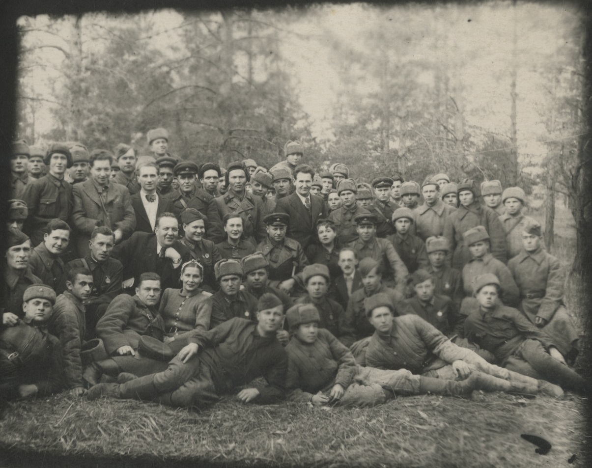 Фотография участников концертной бригады артистов Киргизской ССР с бойцами и командирами РККА. Крайний слева в первом ряду – народный артист Киргизской ССР Аширалы Боталиев. [Август 1943 г.] Ф. 970. Оп. 17. Ед. хр. 64. Л. 2