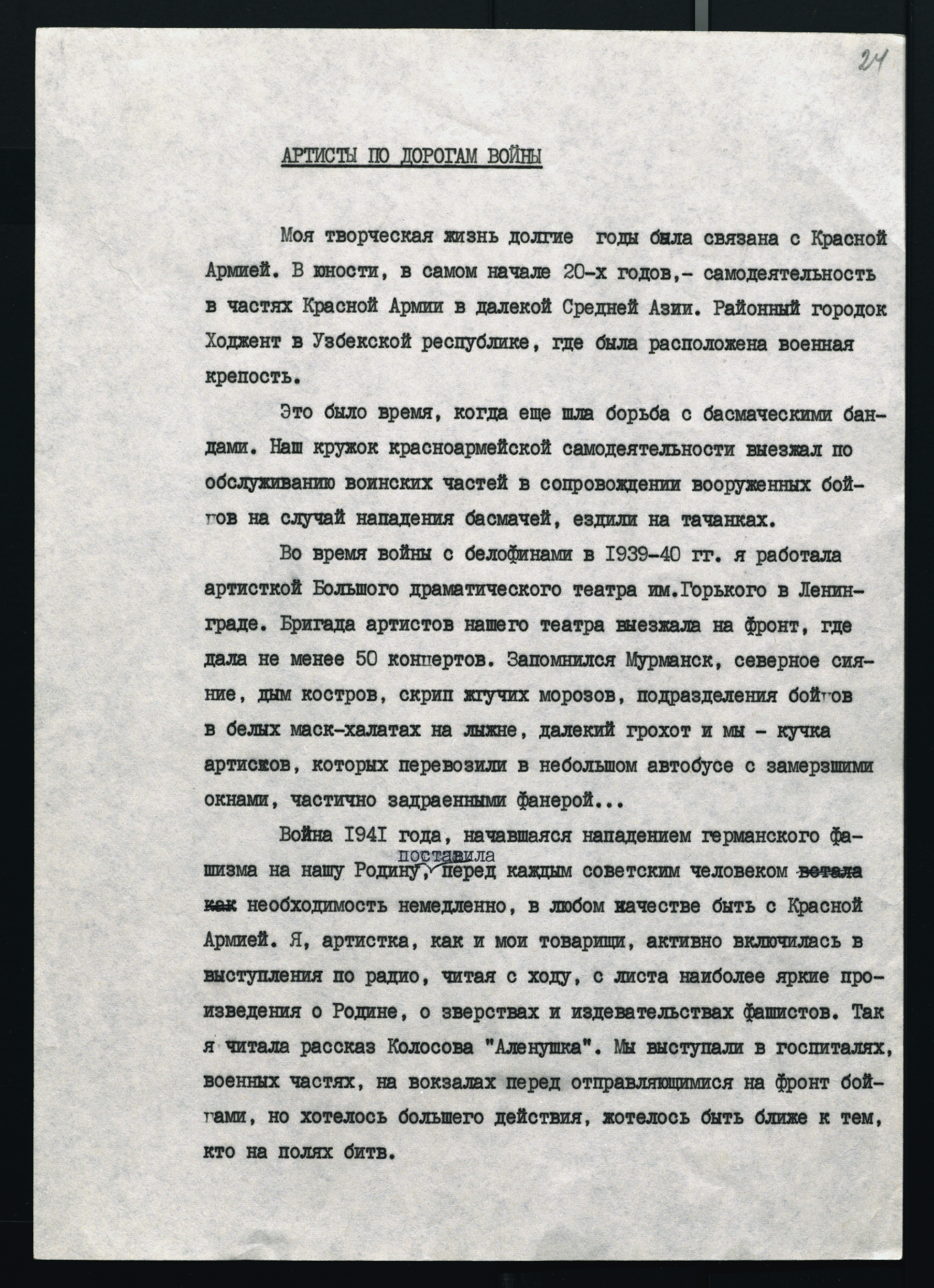 Воспоминания Л.М. Студневой «Артисты по дорогам войны» о работе в составе фронтовых концертных бригад. [1960-е – 1980-е] гг. Авторизованная машинопись. Ф. 3053. Оп. 1. Ед. хр. 8. Л. 24-37