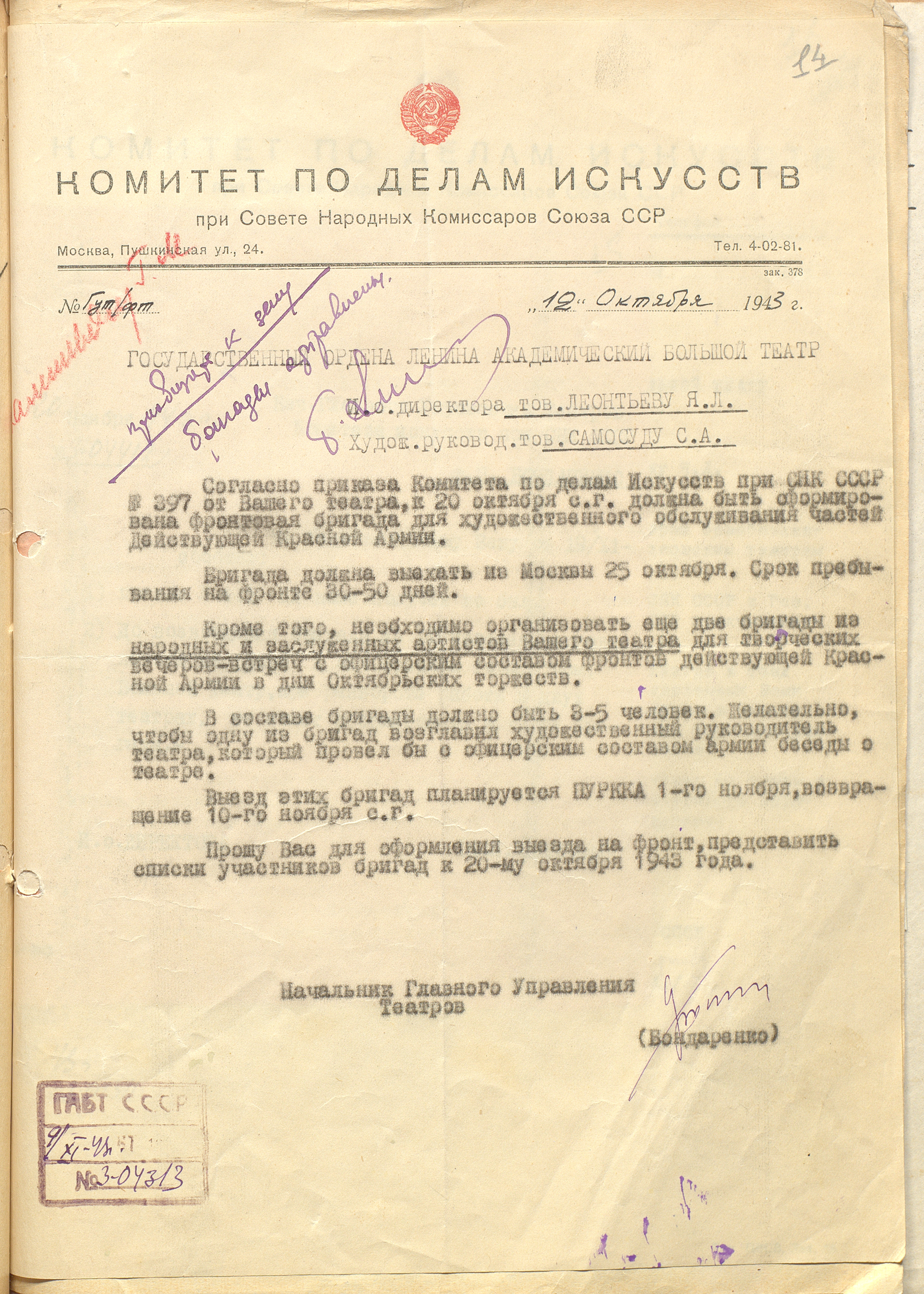 Письмо начальника Главного управления театров КПДИ при СНК СССР Ф.П. Бондаренко руководству Большого театра о необходимости формирования двух концертных бригад для обслуживания частей действующей армии. 12 октября 1943 г. Машинопись. Ф. 648. Оп. 5. Ед. хр. 73. Л. 14