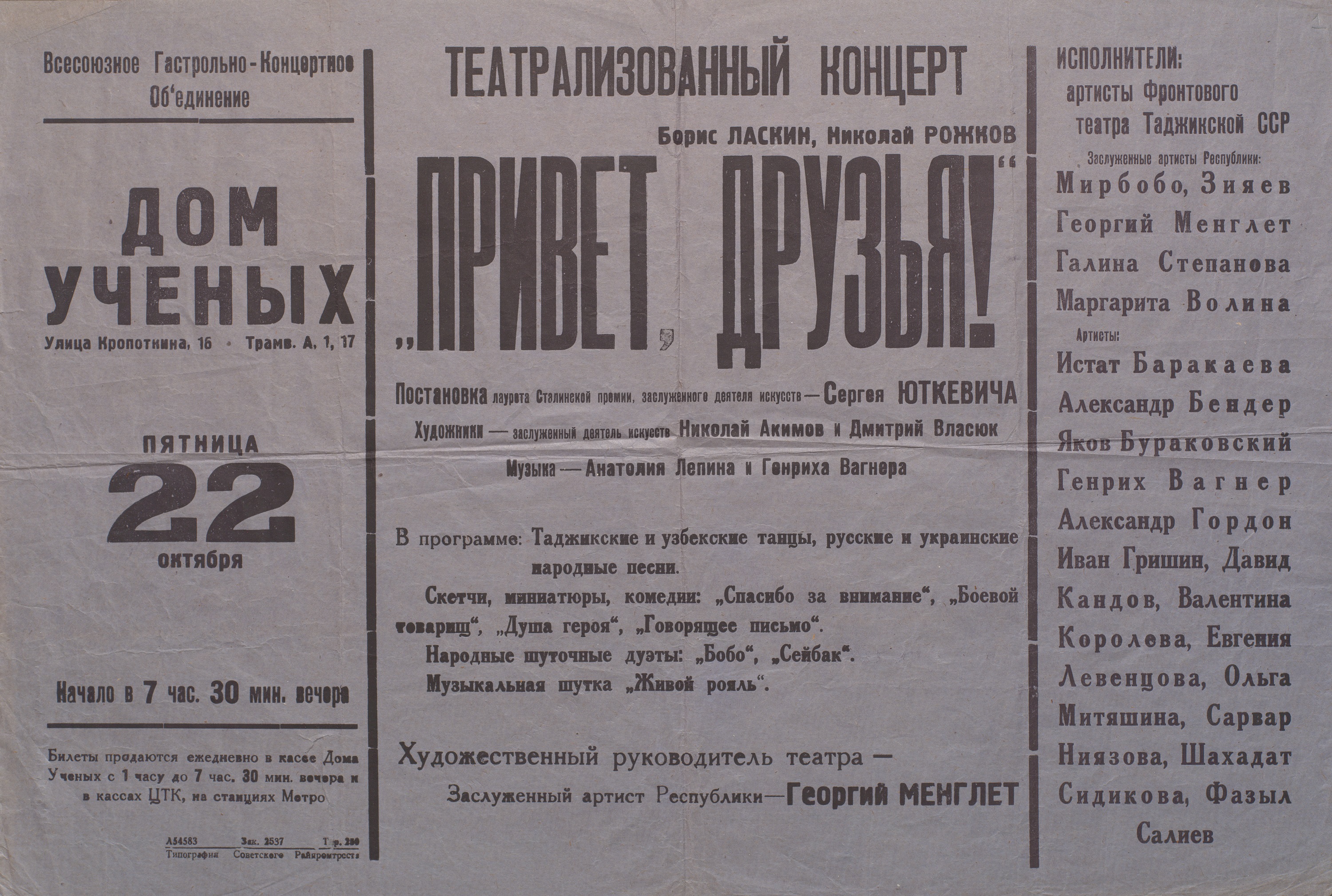 Афиша театрализованного концерта артистов Фронтового театра Таджикской ССР «Привет, друзья» в Доме ученых в Москве (постановка С.И. Юткевича). 22 октября 1943 г. Типограф. экз. Ф. 3070. Оп. 1. Ед. хр. 1046. Л.1