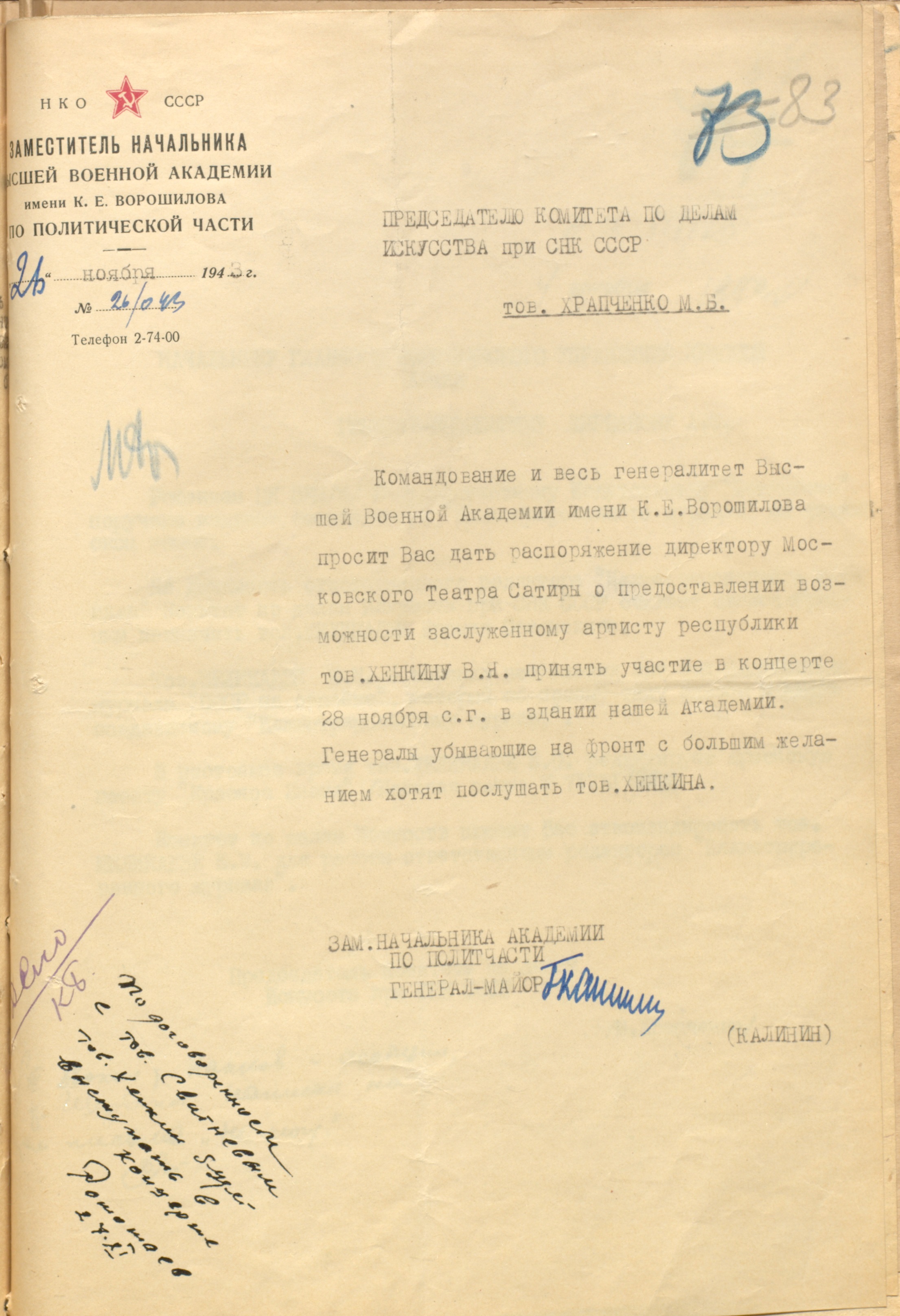 Письмо заместителя начальника Высшей военной академии им. К.Е. Ворошилова по политической части генерал-майора Г.Я. Калинина М.Б. Храпченко об участии заслуженного артиста РСФСР В.Я. Хенкина в концерте для слушателей академии. 26 ноября 1943 г. Машинопись. Ф. 962. Оп. 3. Ед. хр. 1143. Л. 83