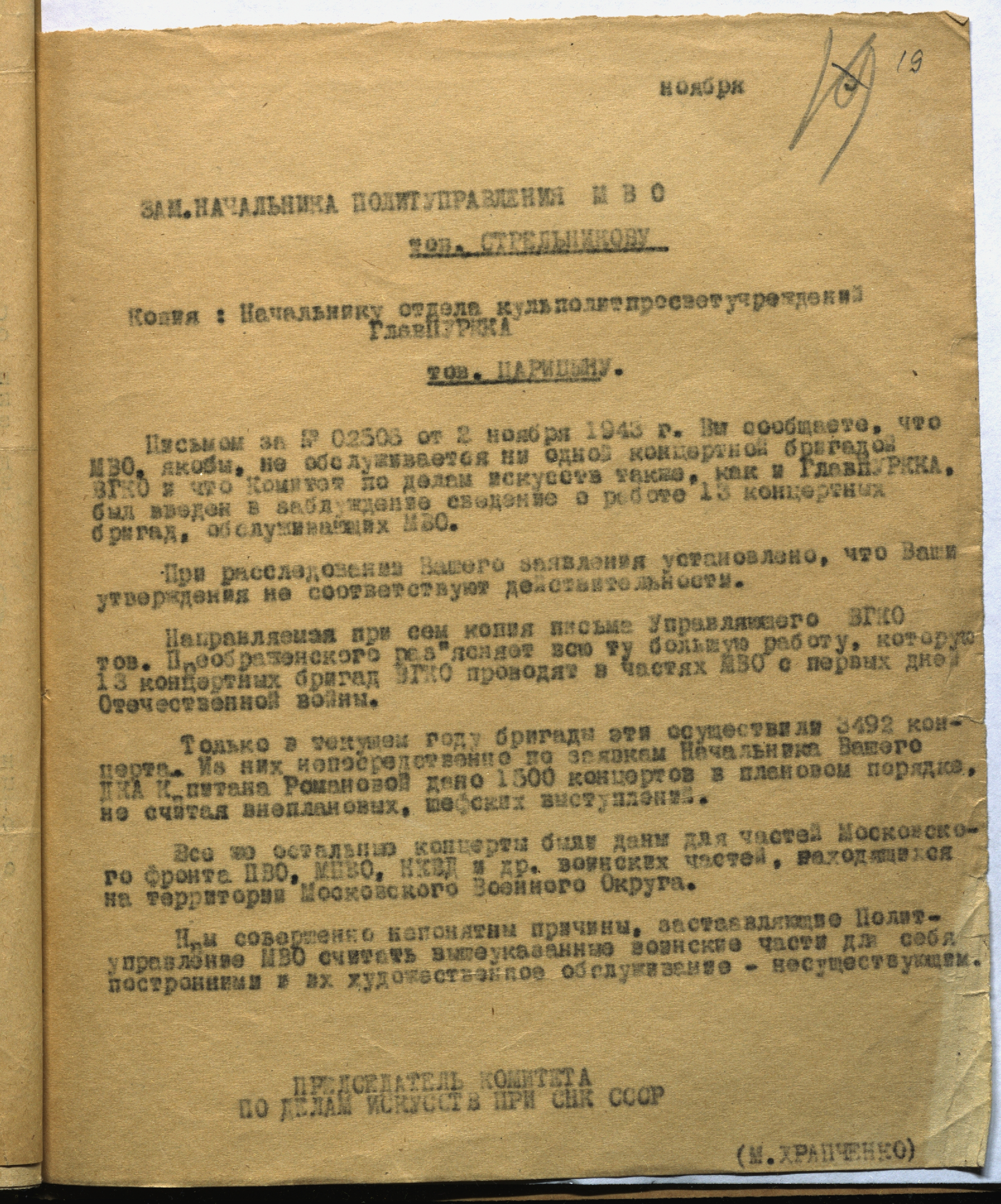Письмо М.Б. Храпченко начальнику отдела культполитпросветучреждений ГлавПУРККА А.А. Царицыну о причинах отсутствия фронтовых бригад ВГКО, обслуживавших Московский военный округ. Ноябрь 1943 г. Машинописная копия. Ф. 962. Оп. 5. Ед. хр. 692. Л. 19