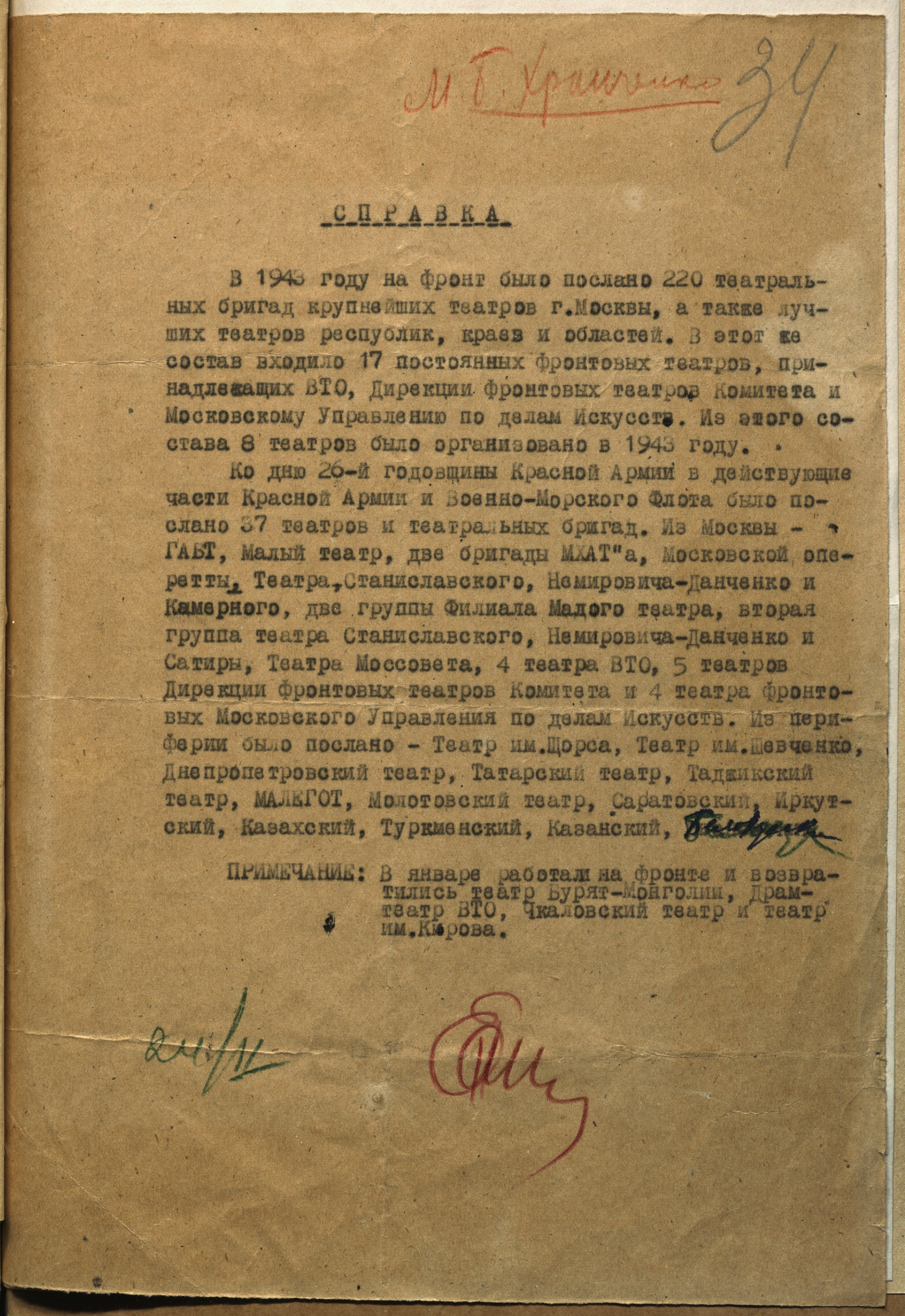 Справка о количестве и составе театральных бригад, занятых художественным обслуживанием действующей армии в 1943 г. 24 февраля [1944 г.] Машинопись. Ф. 962. Оп. 5. Ед. хр. 692. Л. 34