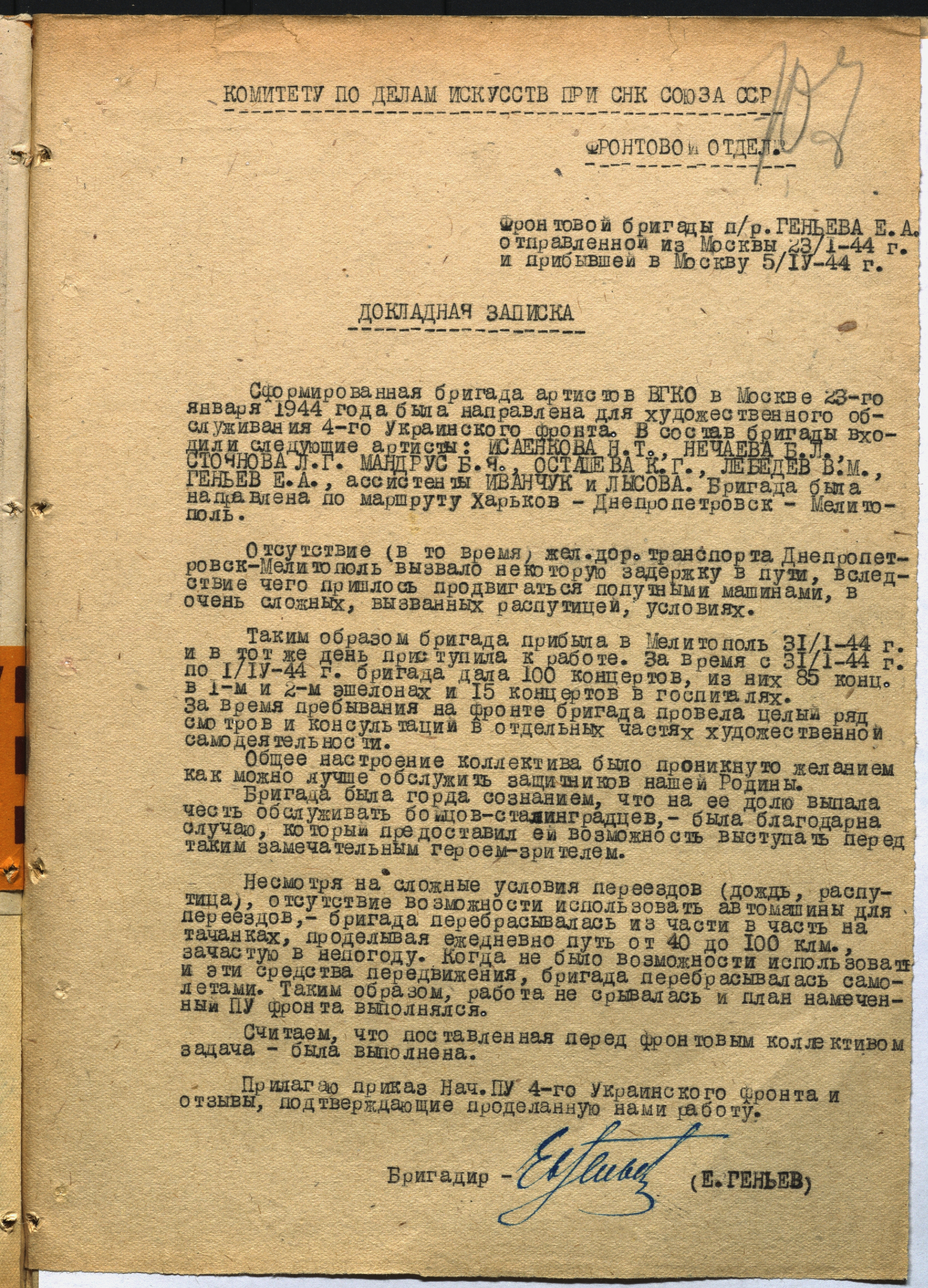 Докладная записка бригадира фронтовой бригады ВГКО под руководством Е.А. Геньева о работе по обслуживанию частей 4-го Украинского фронта в период с 31 января по 1 апреля 1944 г. [Апрель 1944 г.] Машинопись. Ф. 962. Оп. 5. Ед. хр. 640. Л. 107