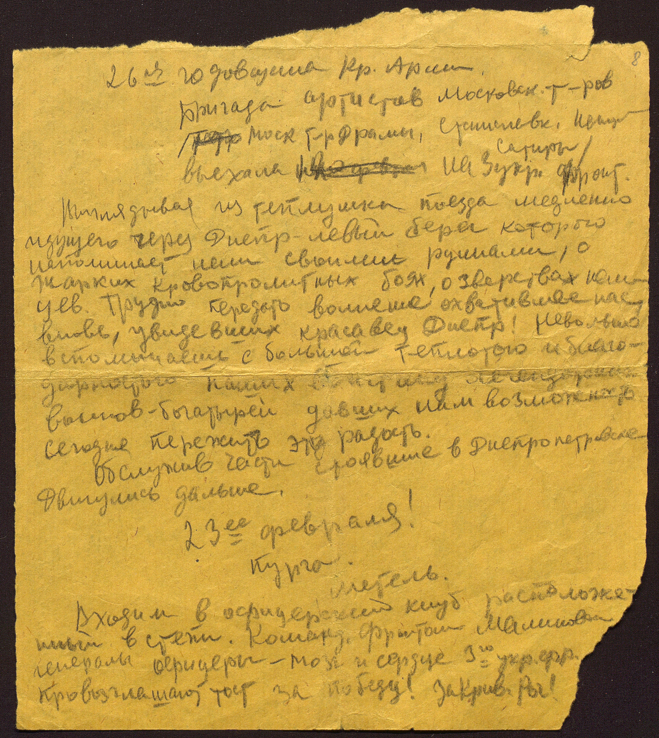 Запись Л.Н. Свердлина о поездке сборной концертной бригады артистов московских театров на 3-й Украинский фронт. [Февраль 1944 г.] Автограф. Ф. 2953. Оп. 1. Ед. хр. 217. Л. 8-8об