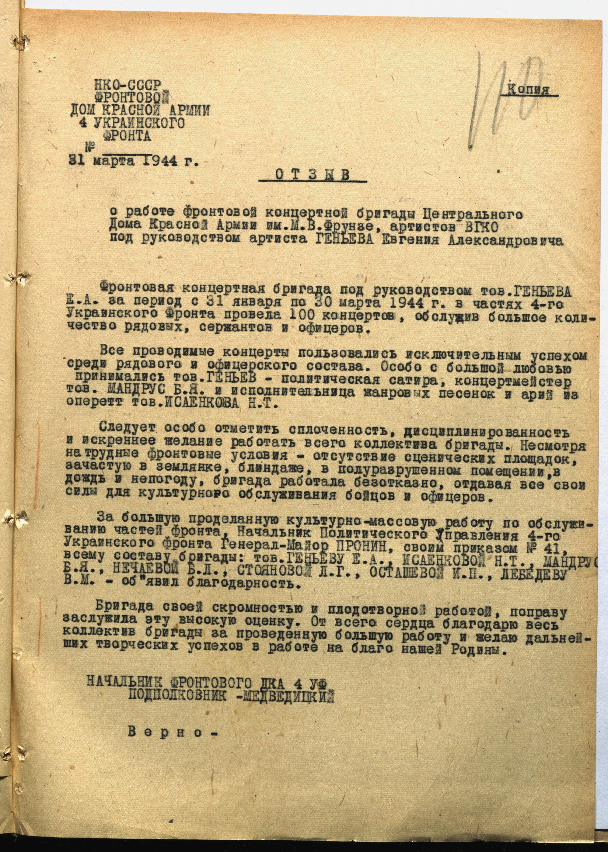 Отзыв начальника фронтового Дома Красной армии 4-го Украинского фронта подполковника Медведицкого о работе фронтовой концертной бригады Центрального дома Красной армии им. М.В. Фрунзе и артистов ВГКО под руководством Е.А. Геньева. 31 марта 1944 г. Машинописная копия. Ф. 962. Оп. 5. Ед. хр. 640. Л. 110