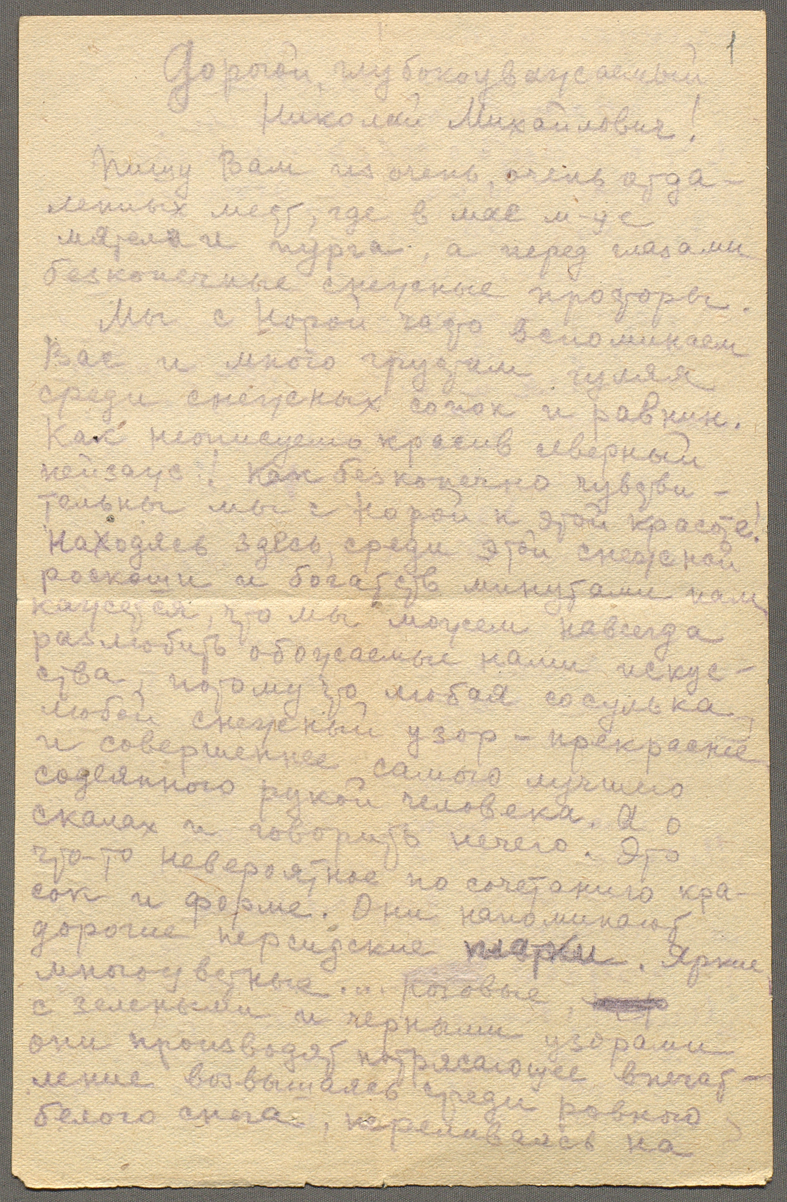 Письмо участницы фронтовой бригады ВГКО под руководством В.Л. Жемчужного В.Х. Беатовой Н.М. Горчакову о пребывании на Северном флоте. 10 мая 1944 г. Рукопись. Ф. 2959. Оп. 1. Ед. хр. 208. Л. 1-2