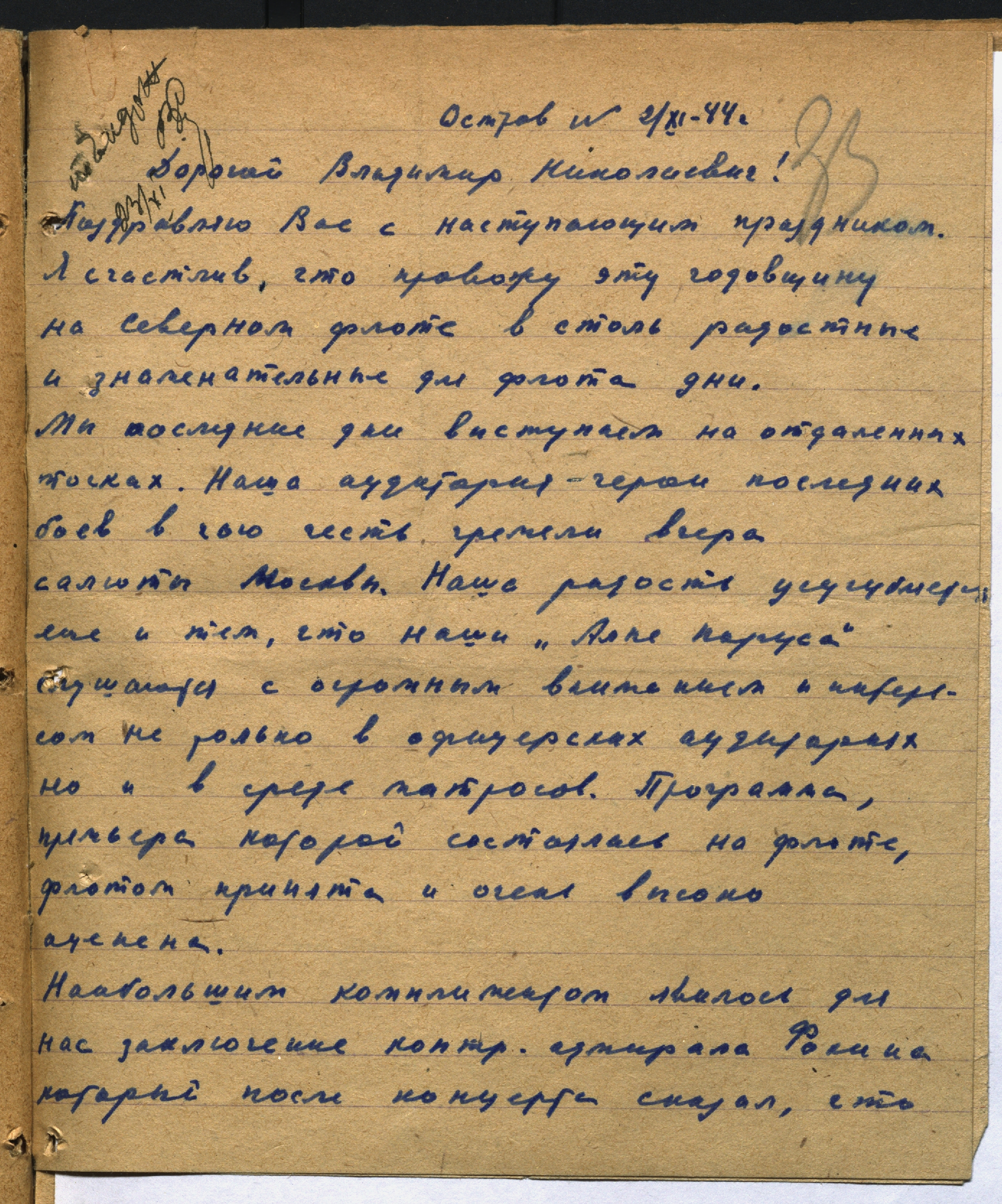 Письмо бригадира фронтовой бригады ВГКО С.Р. Акивиса начальнику Главного управления музыкальными учреждениями КПДИ при СНК СССР В.Н. Сурину о пребывании на Северном флоте. 2 ноября 1944 г. Рукопись. Ф. 962. Оп. 5. Ед. хр. 640. Л. 33-34