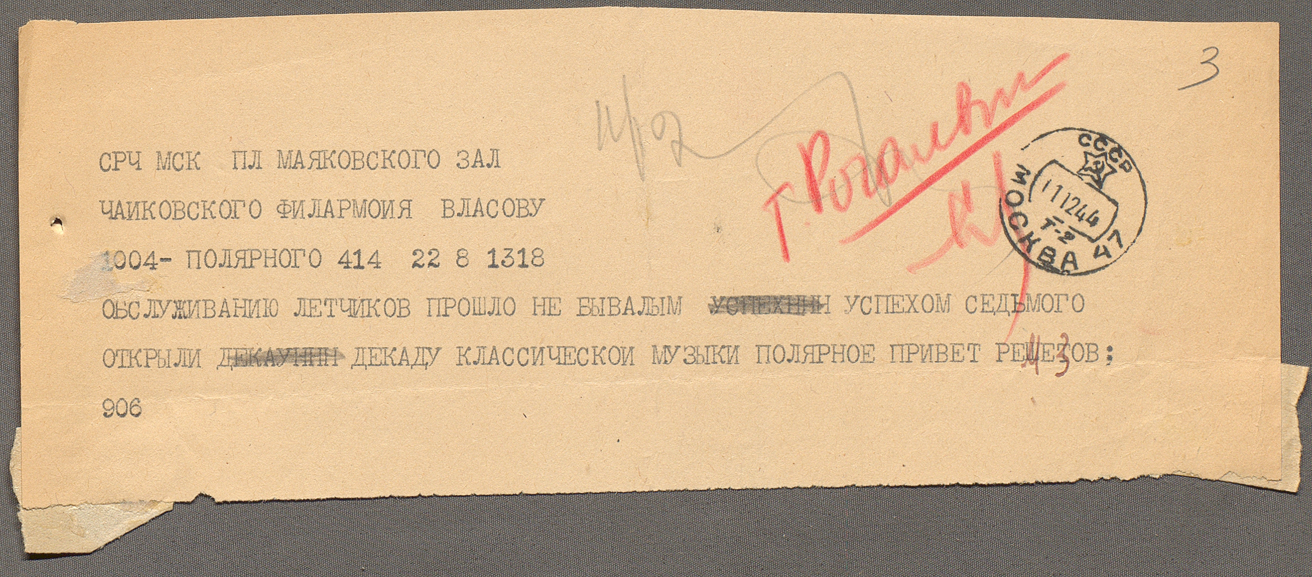 Телеграмма лектора Московской государственной филармонии И.И. Ремезова администрации филармонии о концертах для летчиков Северного флота. 11 декабря 1944 г. Машинопись. Ф. 2922. Оп. 3. Ед. хр. 11. Л. 3