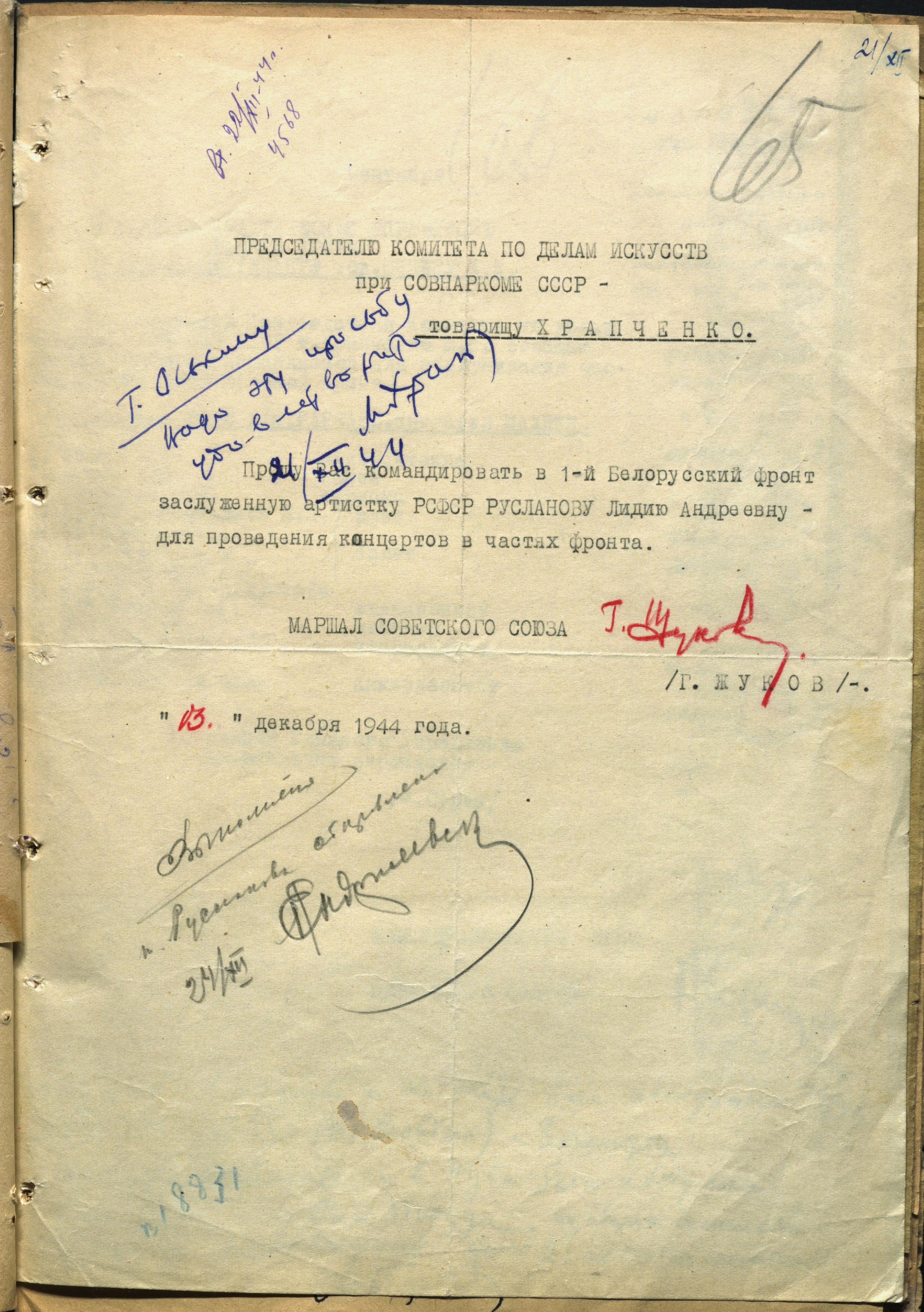 Письмо маршала Советского Союза Г.К. Жукова М.Б. Храпченко о командировании Л.А. Руслановой на 1-й Белорусский фронт. 13 декабря 1944 г. (Резолюция М.Б. Храпченко от 21 декабря 1944 г.: «Надо эту просьбу удовлетворить»). Авторизованная машинопись. Ф. 962. Оп. 5. Ед. хр. 640. Л. 65