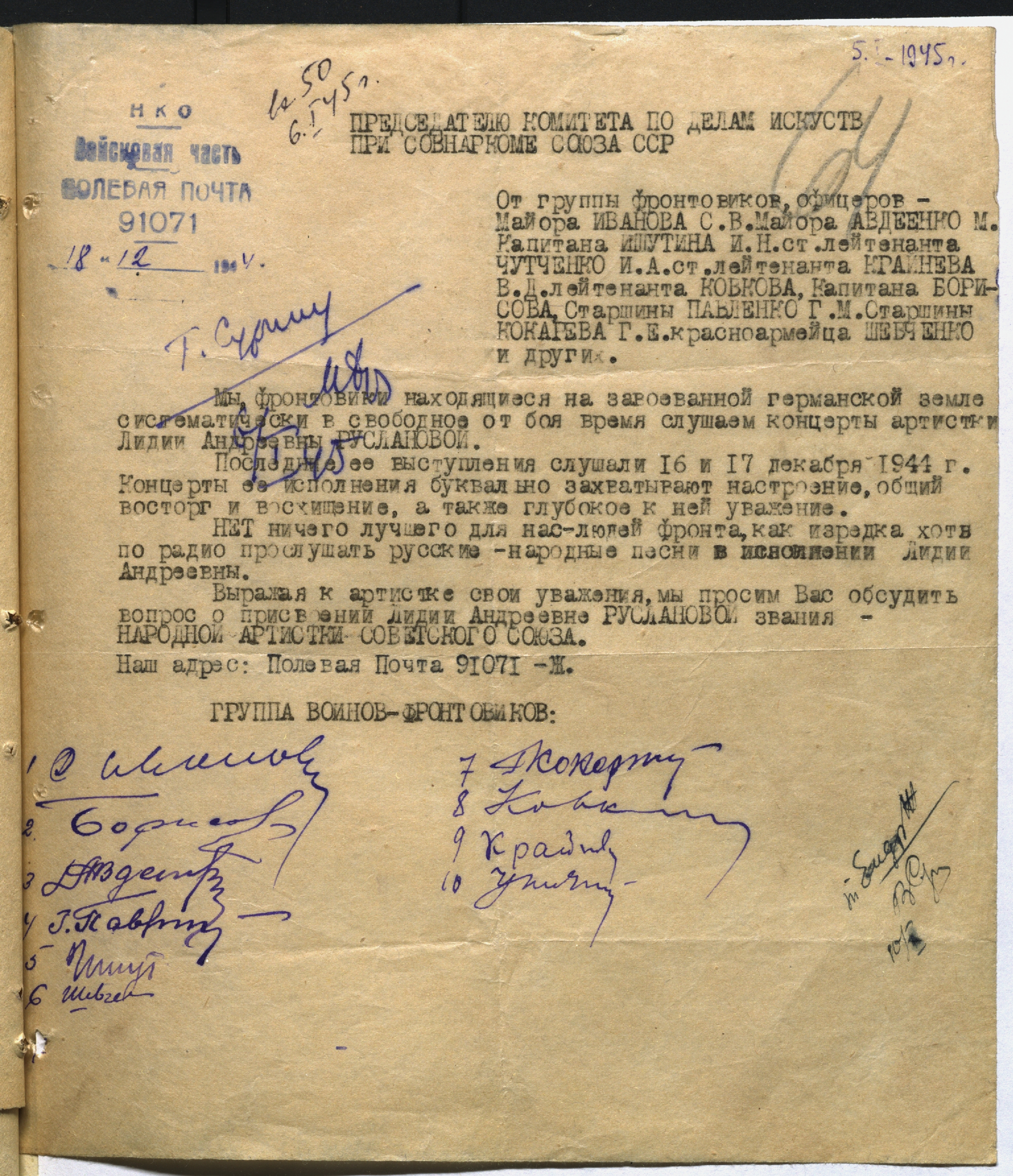 Коллективное письмо группы офицеров 66-го стрелкового полка 61-й стрелковой дивизии о присвоении Л.А. Руслановой звания Народной артистки СССР. 18 декабря 1944 г. Машинопись. Ф. 962. Оп. 5. Ед. хр. 640. Л. 64