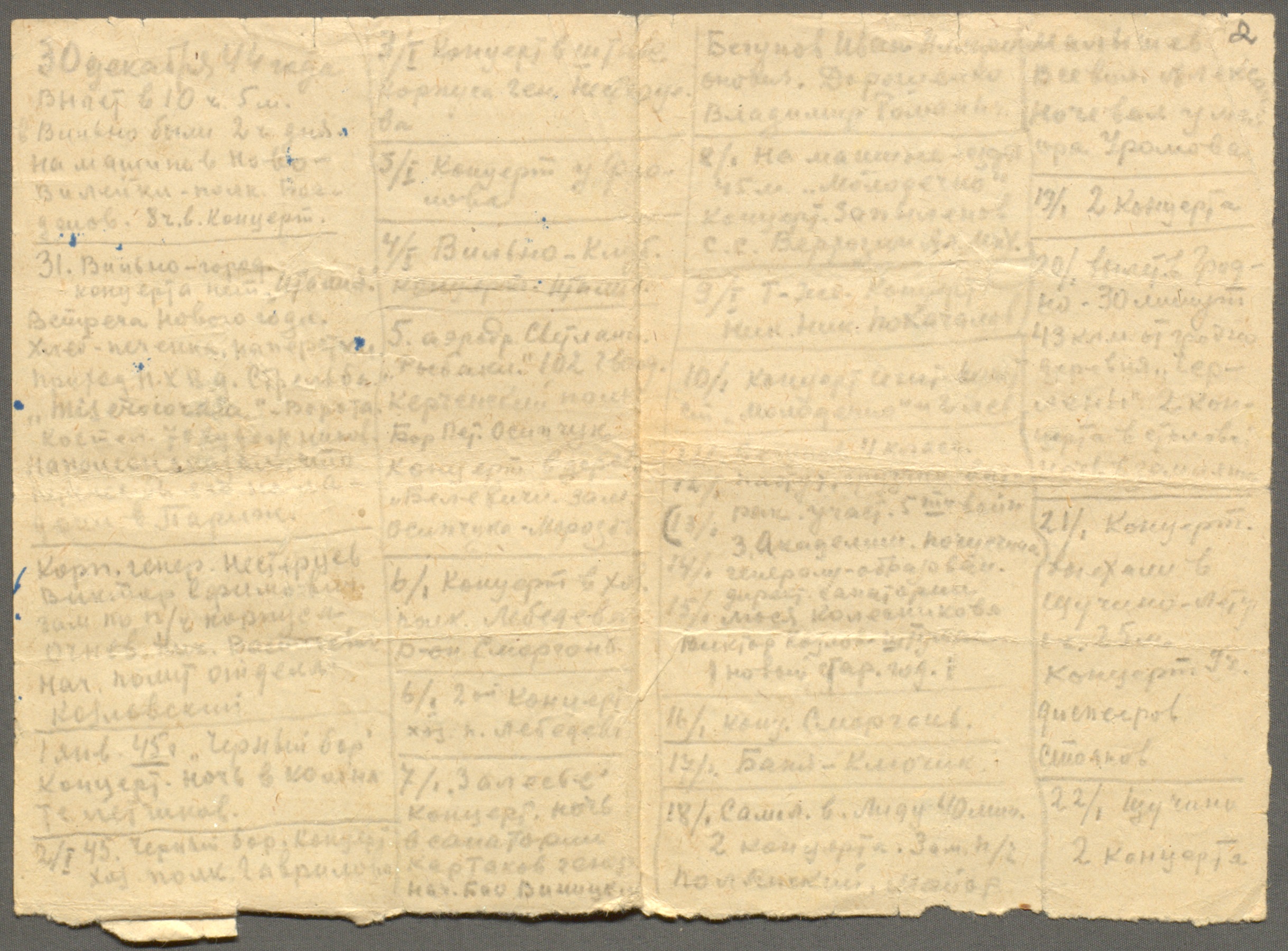 Краткие записи В.А. Латышевского о поездке в составе фронтовой бригады Московского театра драмы в Литовскую и Белорусскую ССР. 30 декабря 1944 – 22 января 1945 гг. Рукопись. Ф. 2620. Оп. 1. Ед. хр. 1130. Л. 1об-2