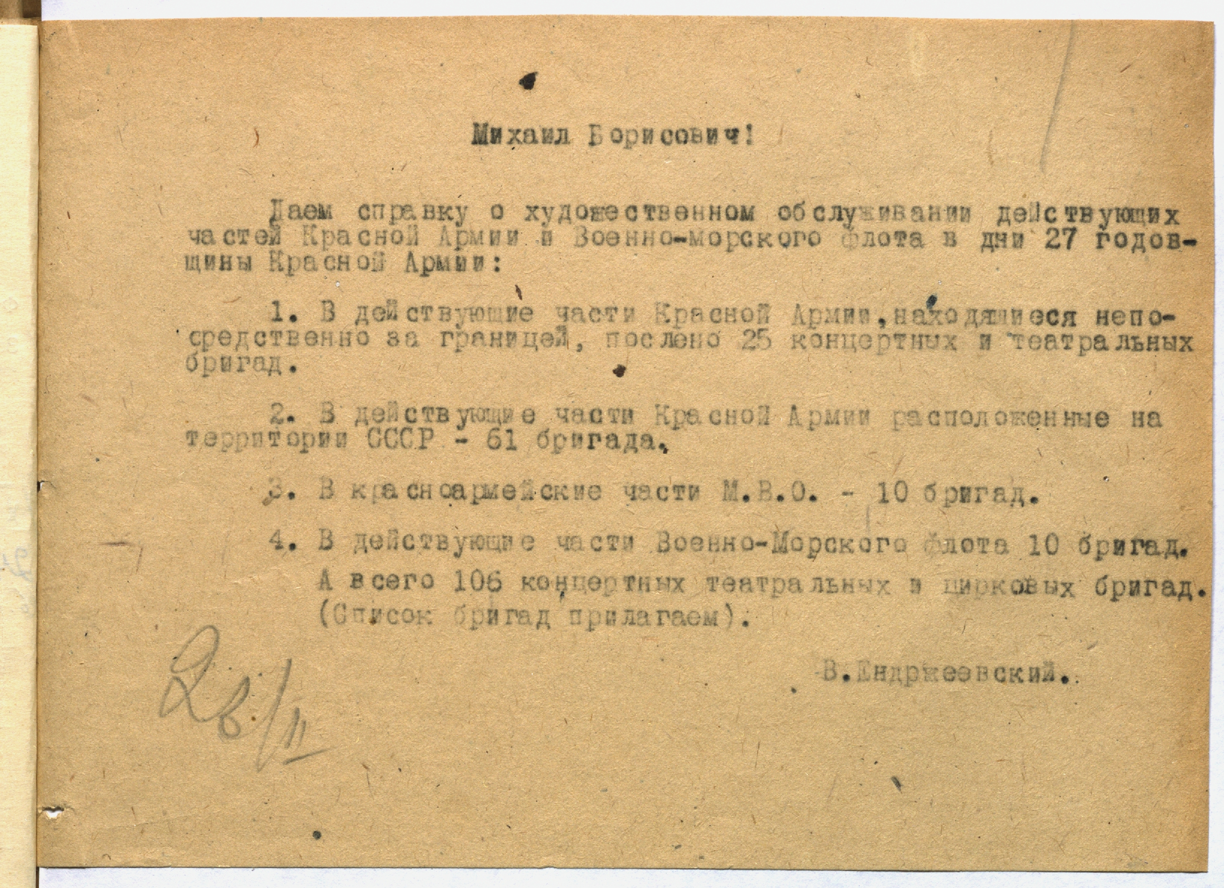 Справка о количестве фронтовых бригад, занятых в обслуживании частей Красной армии и Военно-морского флота в дни 27-й годовщины Красной армии. 26 февраля [1945 г.] Машинопись. Ф. 962. Оп. 5. Ед. хр. 692. Л. 1