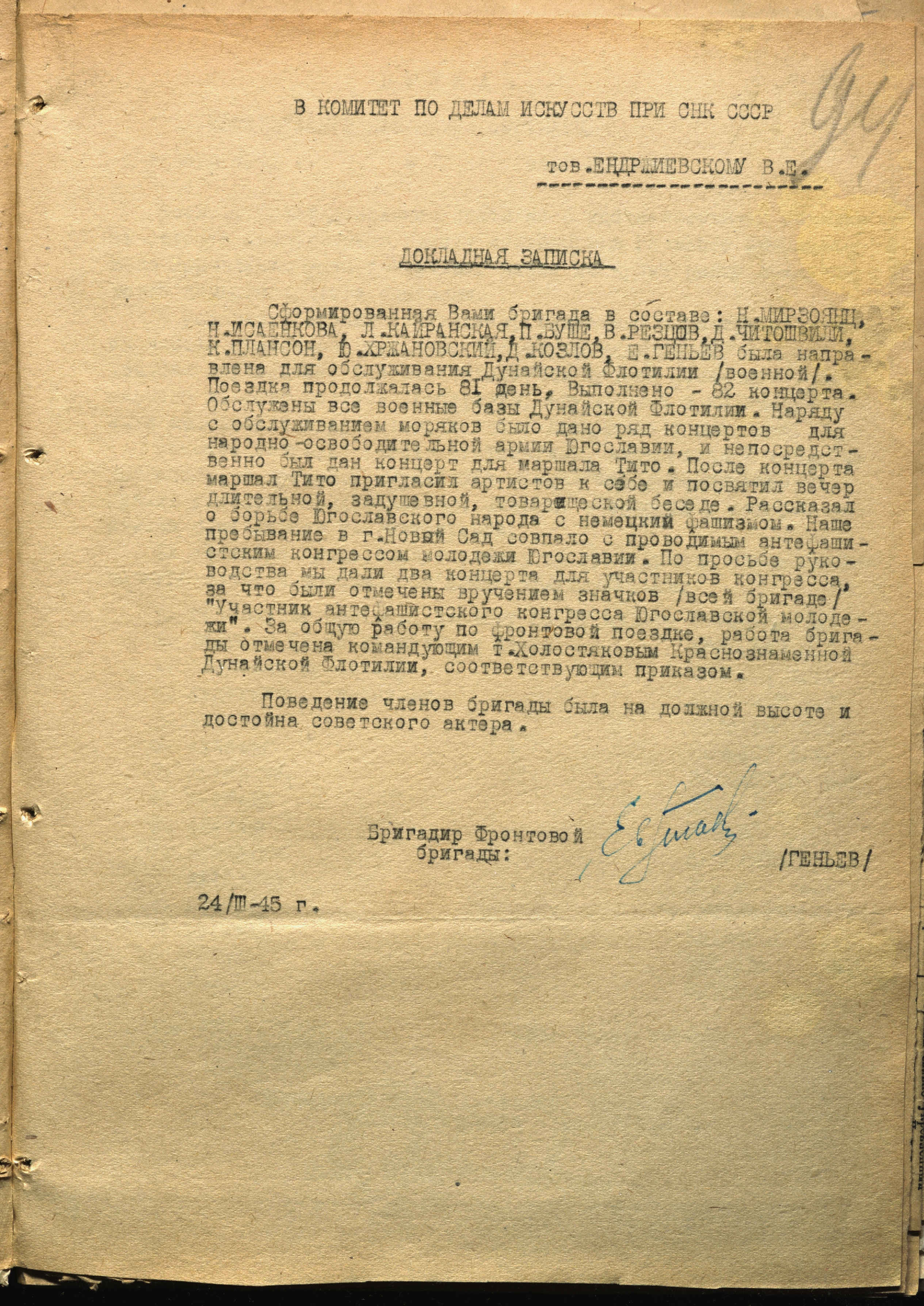 Докладная записка бригадира фронтовой бригады ВГКО под руководством Е.А. Геньева о концертном обслуживании военных баз Дунайской флотилии и участии в антифашистском конгрессе молодежи Югославии. 24 марта 1945 г. Машинопись. Ф. 962. Оп. 5. Ед. хр. 640. Л. 94