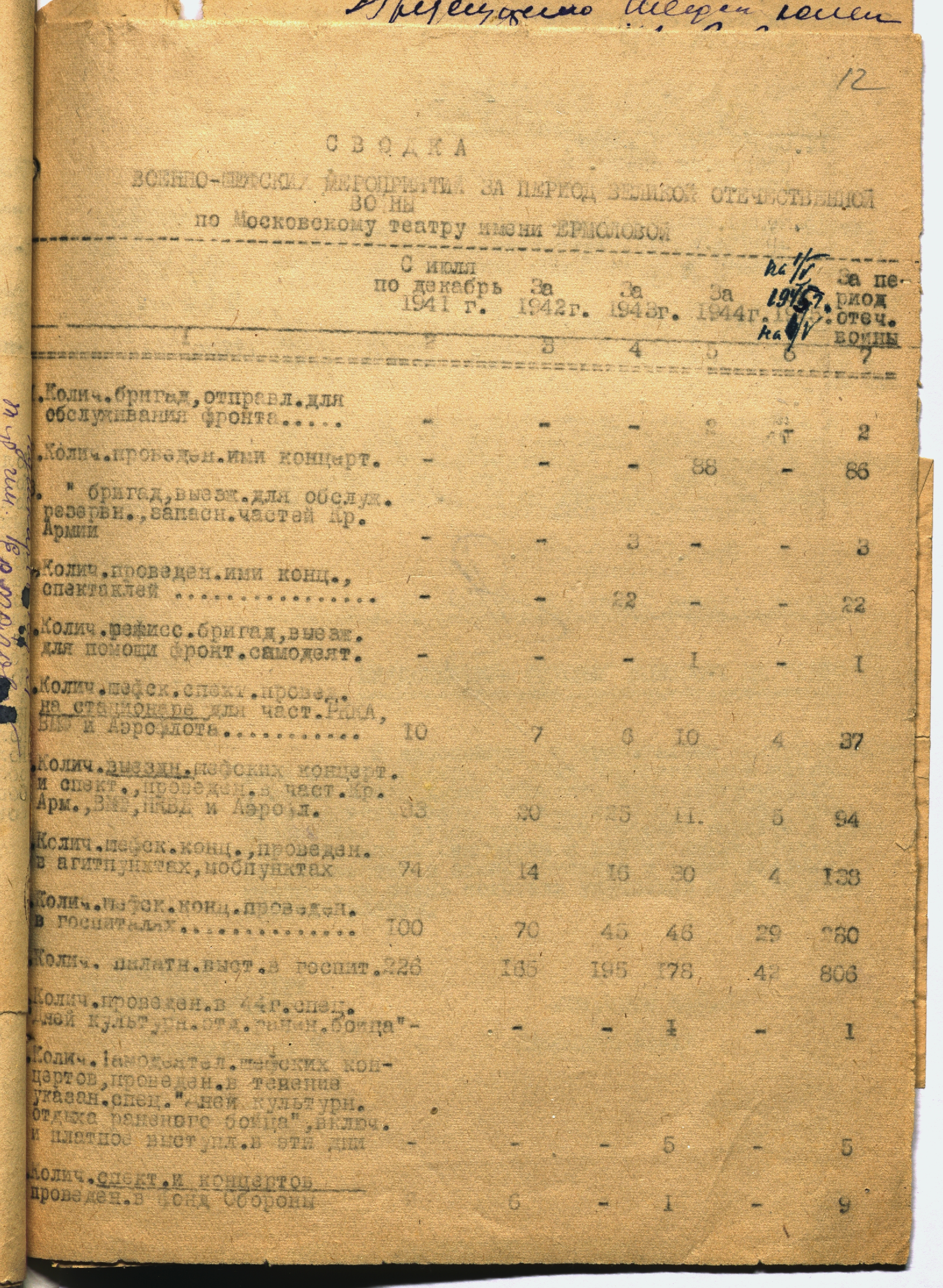Справка о количестве шефских концертов Московского государственного театра им. М.Н. Ермоловой за период Великой Отечественной войны. 1945 г. Машинопись. Ф. 2949. Оп. 1. Ед. хр. 76. Л. 12-12об
