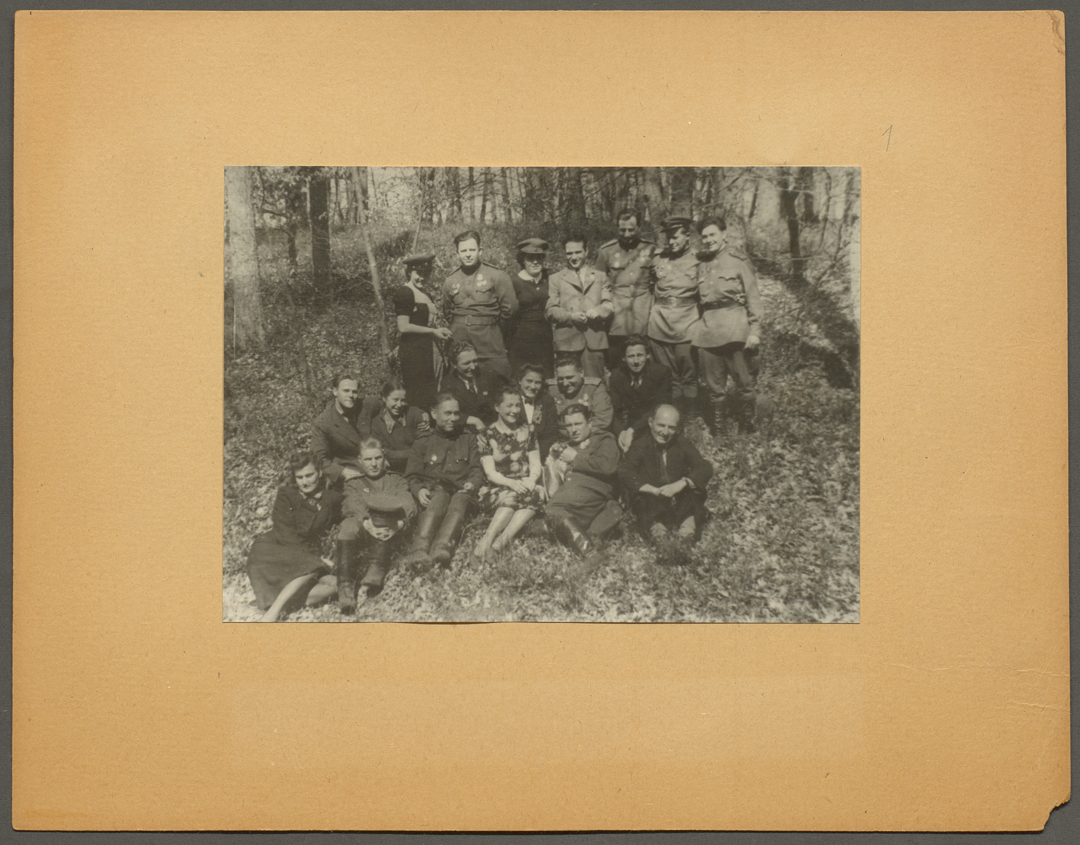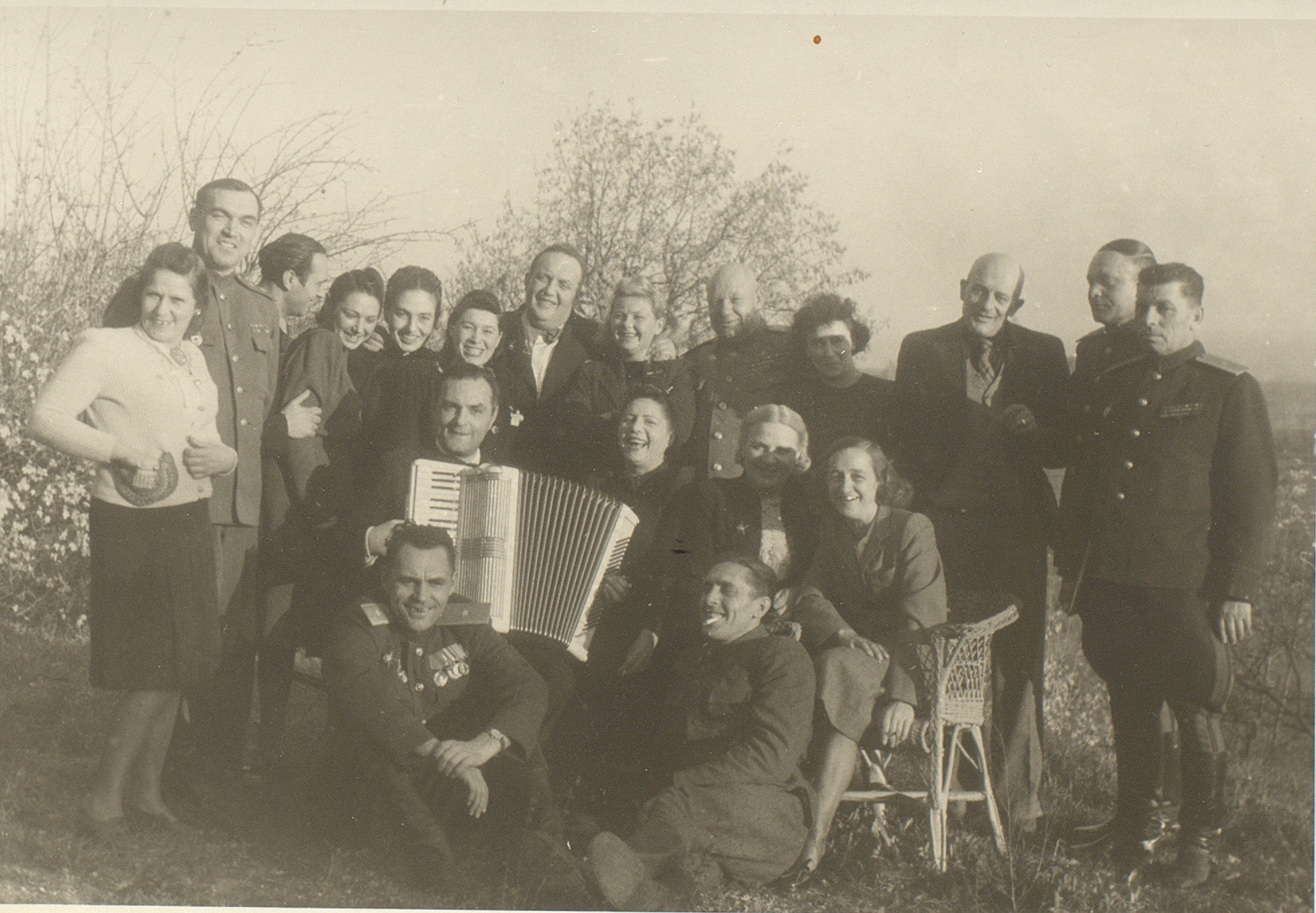 Фотография артистов фронтовой концертной бригады под руководством М.Н. Гаркави (стоит 7-й слева) в группе с офицерами и бойцами РККА в Австрии. 9-й слева стоит командующий 7-й гвардейской армией генерал-полковник М.С. Шумилов. Май 1945 г. Ф. 3063. Оп. 1. Ед. хр. 136. Л. 18