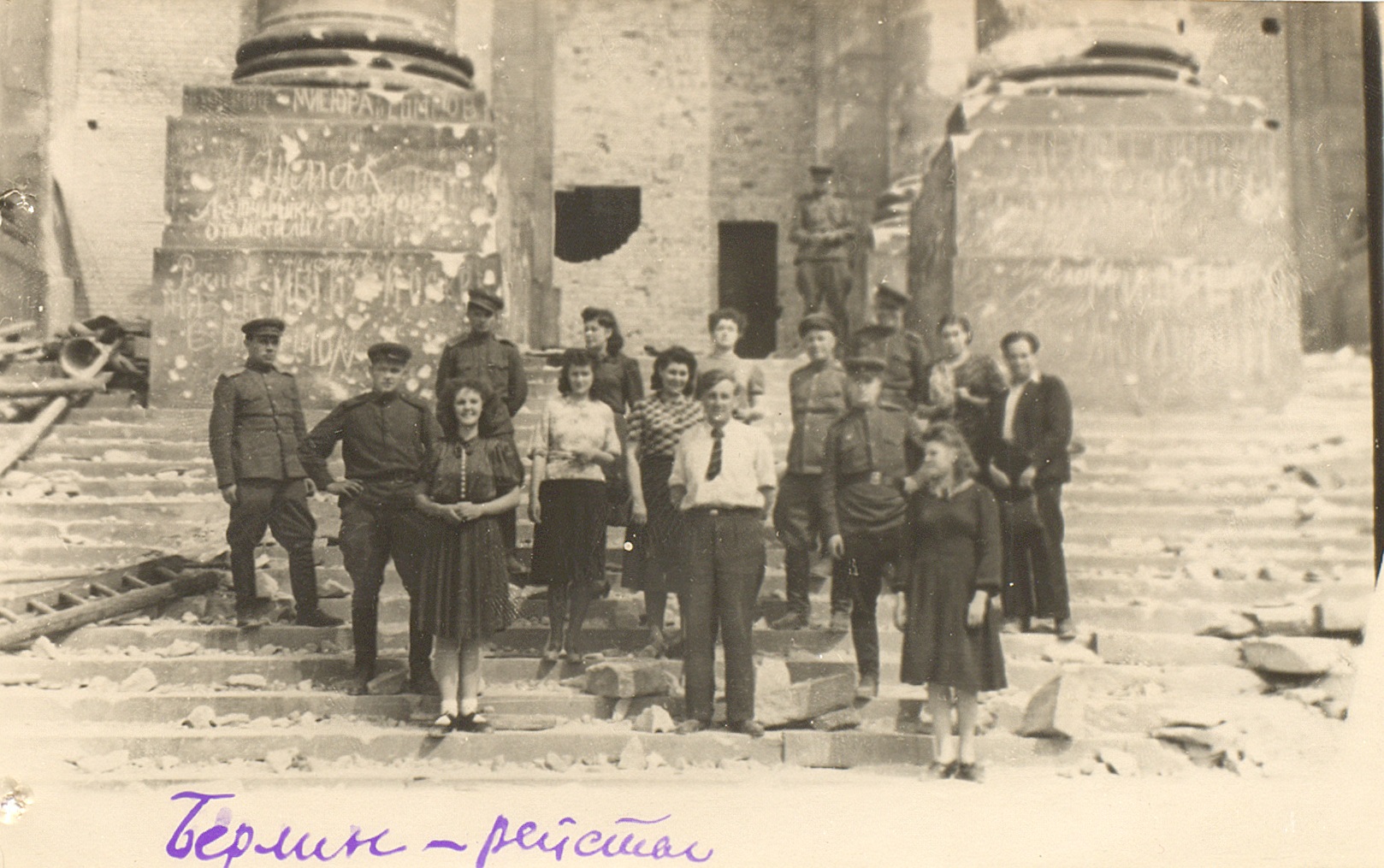 Фотография фронтовой бригады Московской областной филармонии под руководством А.Ф. Симонова у стен Рейхстага. 15 мая 1945 г. Ф. 962. Оп. 5. Ед. хр. 818. Л. 55