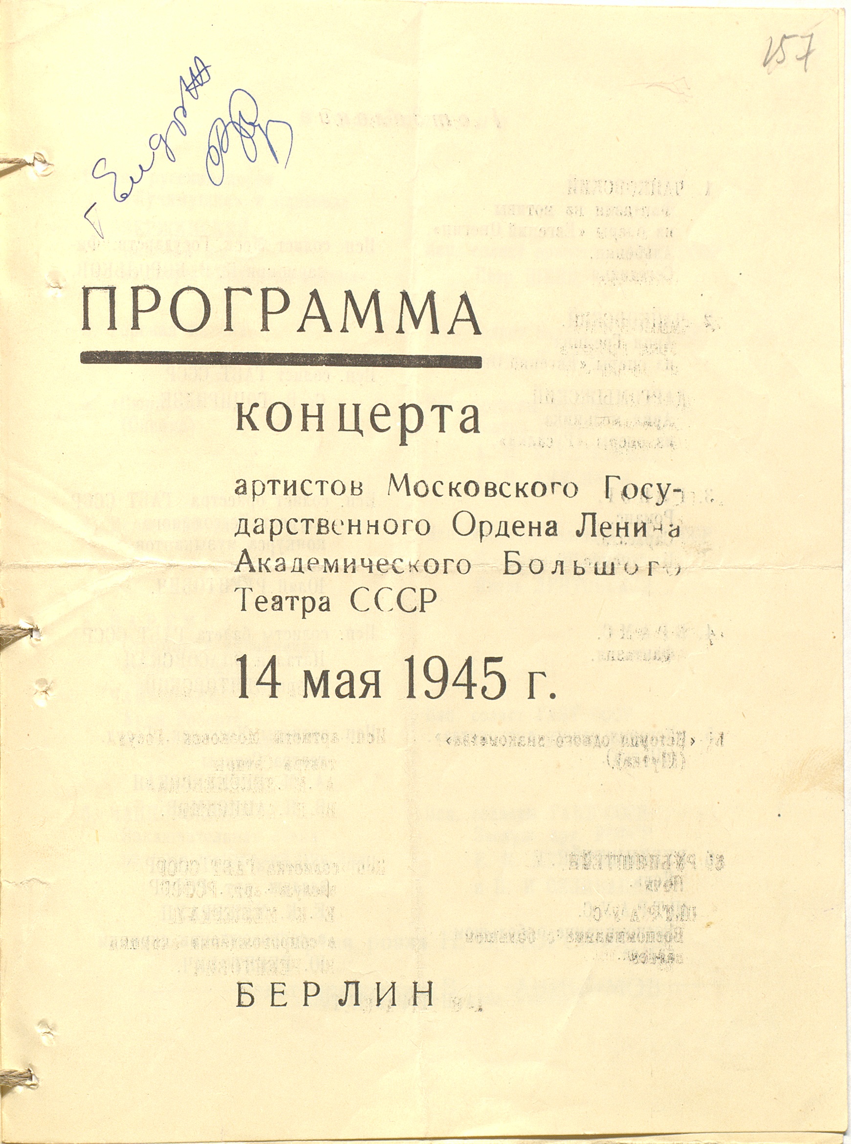 Программа концерта артистов Государственного академического Большого театра СССР в Берлине 14 мая 1945 г. Типограф. экз. Ф. 962. Оп. 5. Ед. хр. 818. Л. 157-158
