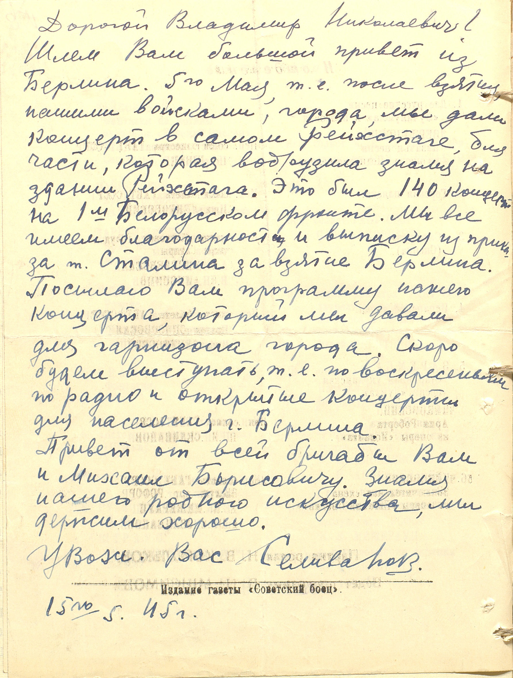 Письмо солиста Государственного академического Большого театра П.В. Селиванова в Комитет по делам искусств при СНК СССР о концертах фронтовой бригады ГАБТ в Берлине в мае 1945 г. 15 мая 1945 г. Рукопись. Ф. 962. Оп. 5. Ед. хр. 818. Л. 158об