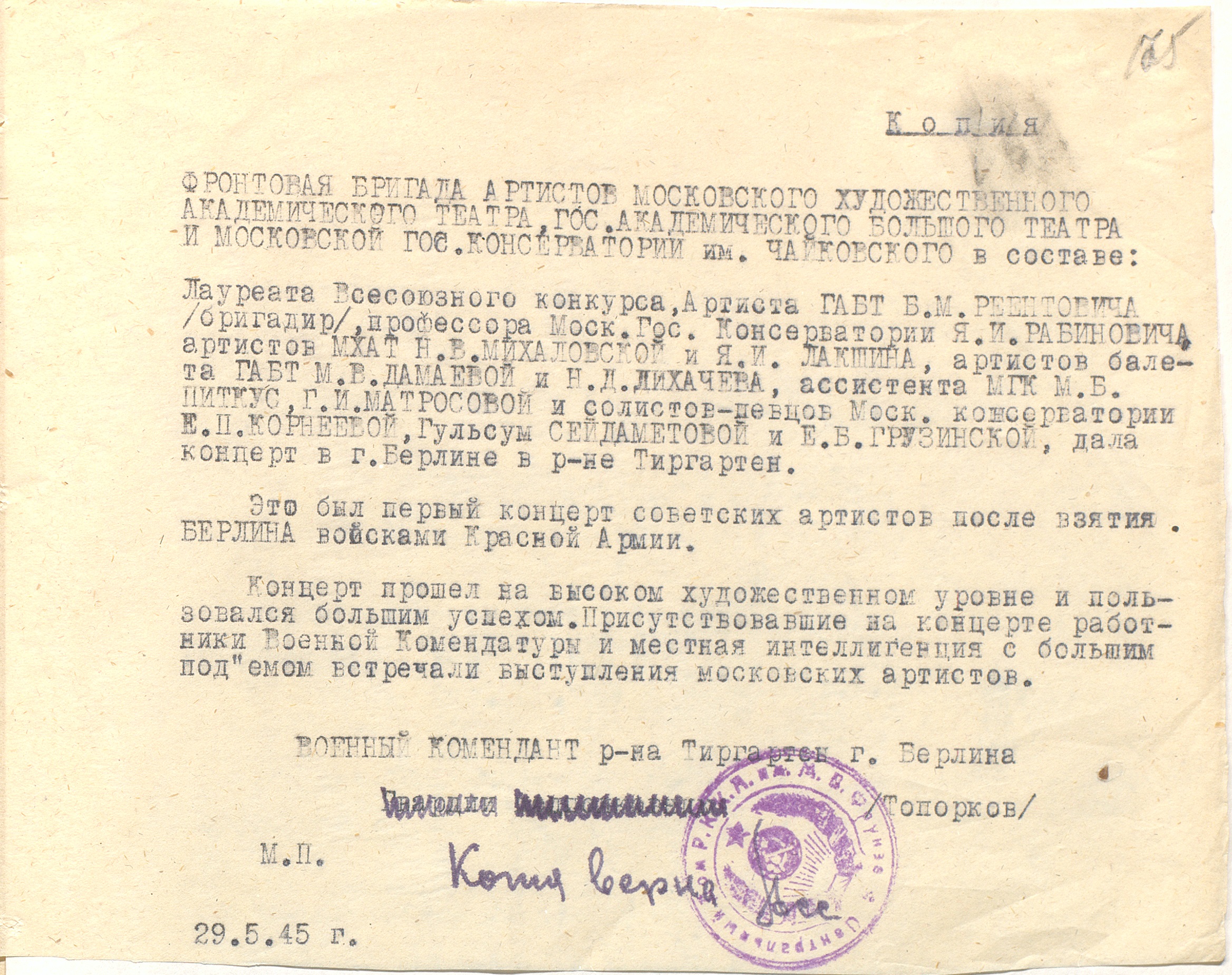Отзыв военного коменданта берлинского района Тиргартен Топоркова о выступлении фронтовой бригады артистов МХАТ, ГАБТ и Московской государственной консерватории им. П.И. Чайковского. 29 мая 1945 г. Машинопись. Ф. 962. Оп. 5. Ед. хр. 818. Л. 175