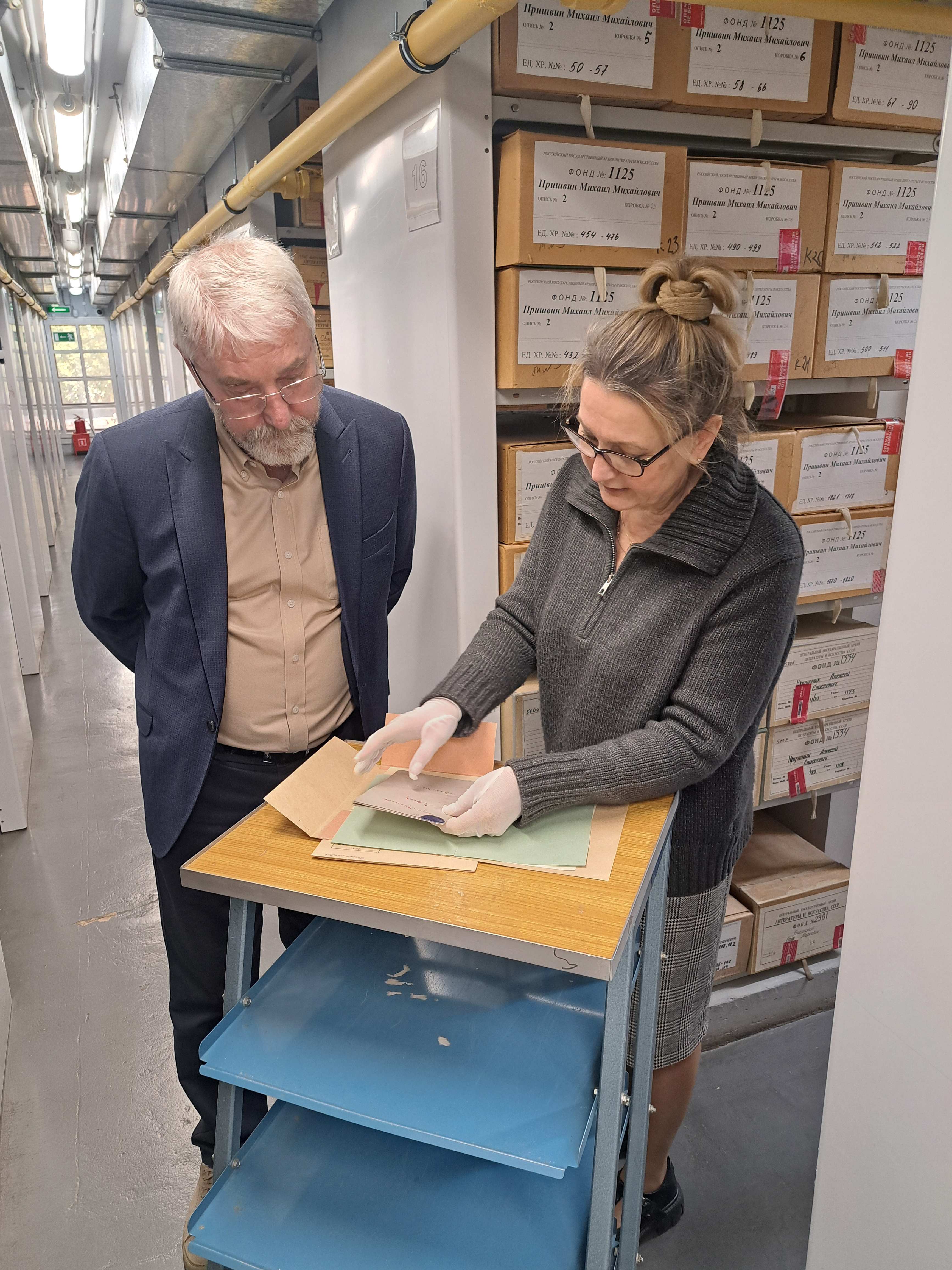 Затем зам. директора архива — главный хранитель Н.Н. Ефимова представила гостю некоторые собрания РГАЛИ, продемонстрировав целый ряд автографов в архивохранилище личных фондов.