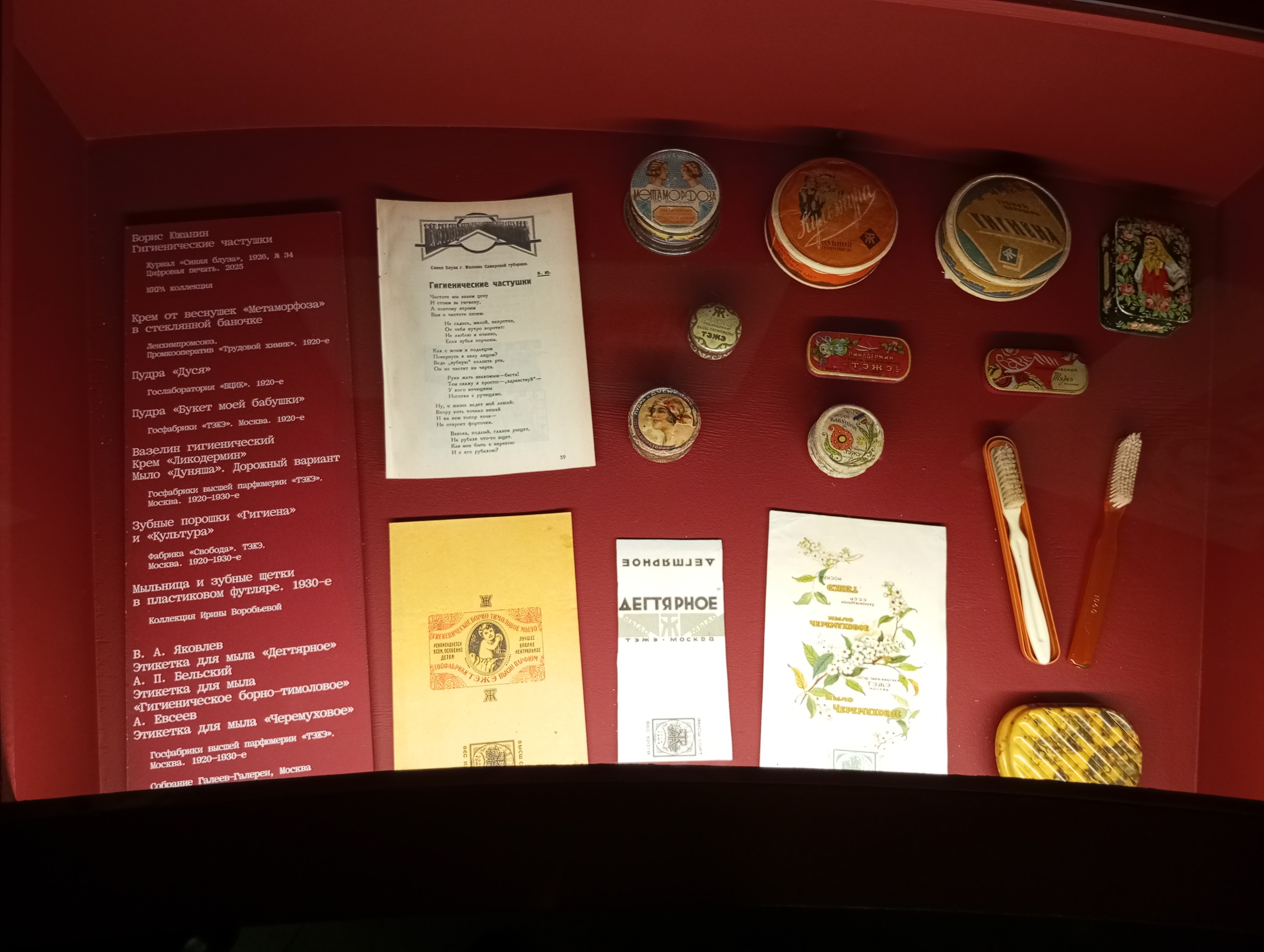 Более 200 экспонатов, от работ известных живописцев до винтажных аксессуаров и ольфакторных инсталляций, представляют посетителям индустрию красоты как историю развития города и преобразования советской повседневности. На выставке, которая посвящена парфюмерной индустрии в России 1920-1930-х годов, продемонстрированы в том числе и документы РГАЛИ из фонда редакции журнала «Наши достижения» за 1937 год. Среди них — фотографии авторства О.Б. Кнорринга, на которых можно увидеть парфюмера Августа Мишеля, внутренний вид магазина ТЭЖЭ. Расшифровка названия этого магазина сегодня представляется забавной — «Трест Жиркость»! Но еще более интересна история магазина. Поскольку после переворота 1917 года в стране фактически не стало моющих средств, то все существовавшие на тот момент парфюмерные фабрики переориентировали на выпуск мыла, назвав их мыловаренными заводами. Однако согласились с такой постановкой дела далеко не все. «Несогласные» и объединились в трест «Жиркость», или ТЭЖЭ. Под этой аббревиатурой в 1920-е — 1930-е годы выпускалась вся парфюмерная продукция, в том числе и знаменитые духи «Красная Москва», которые, по одной из версий, ранее были известны под названием «Любимый букет императрицы».