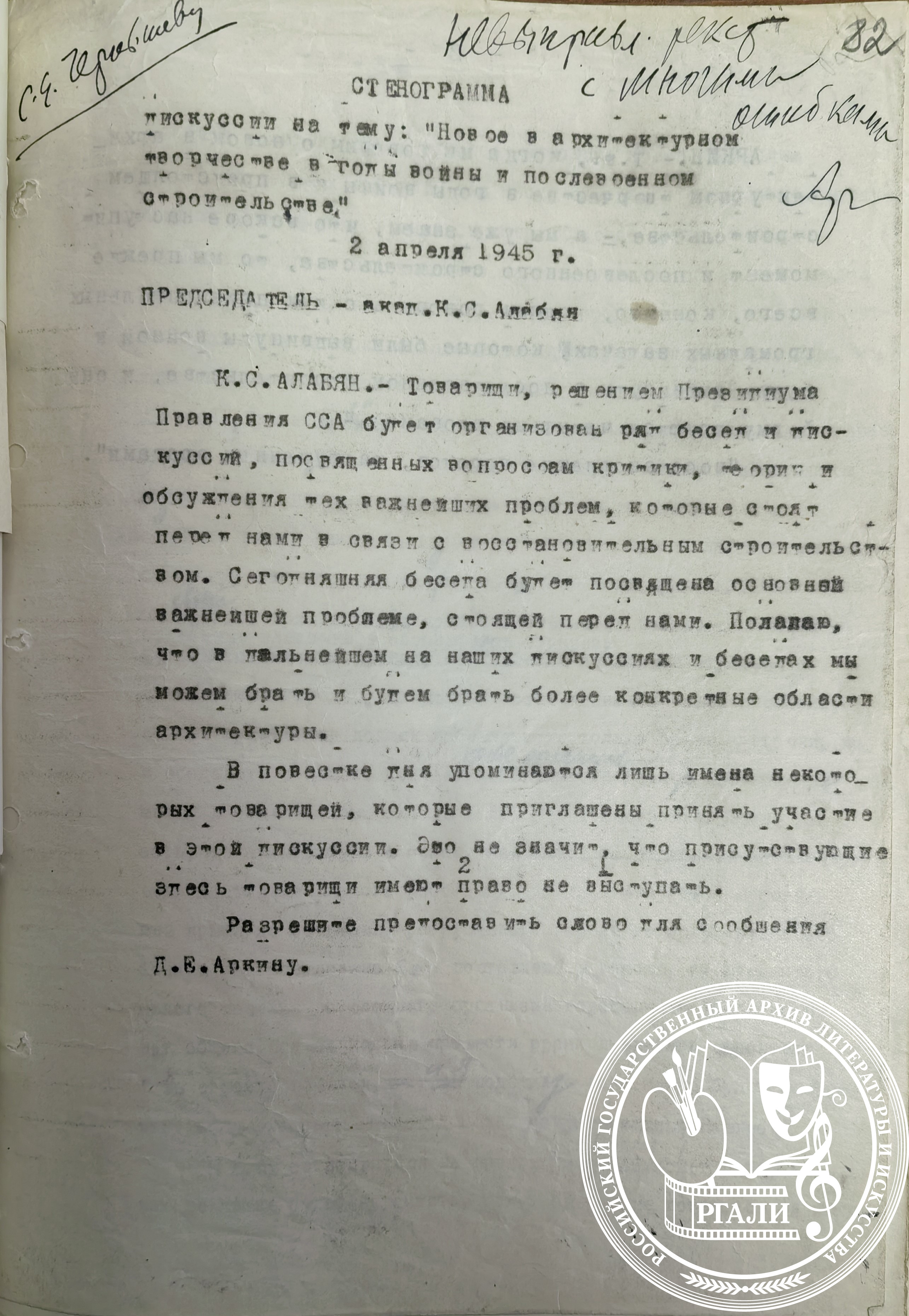 В связи с этим вспомним об одном интересном документе из фонда Союза архитекторов СССР (Москва, 1932–1991) в РГАЛИ. Речь идет о стенограмме творческой дискуссии «Новое в архитектурном творчестве в годы войны и послевоенном строительстве», проходившей 2 апреля 1945 года в Доме архитектора. Среди присутствующих — архитекторы Б. Былинкин, Г. Гольц, Б. Иофан, Н. Колли, Л. Руднев и А. Щусев, имена которых сегодня звучат как гимн эпохе.