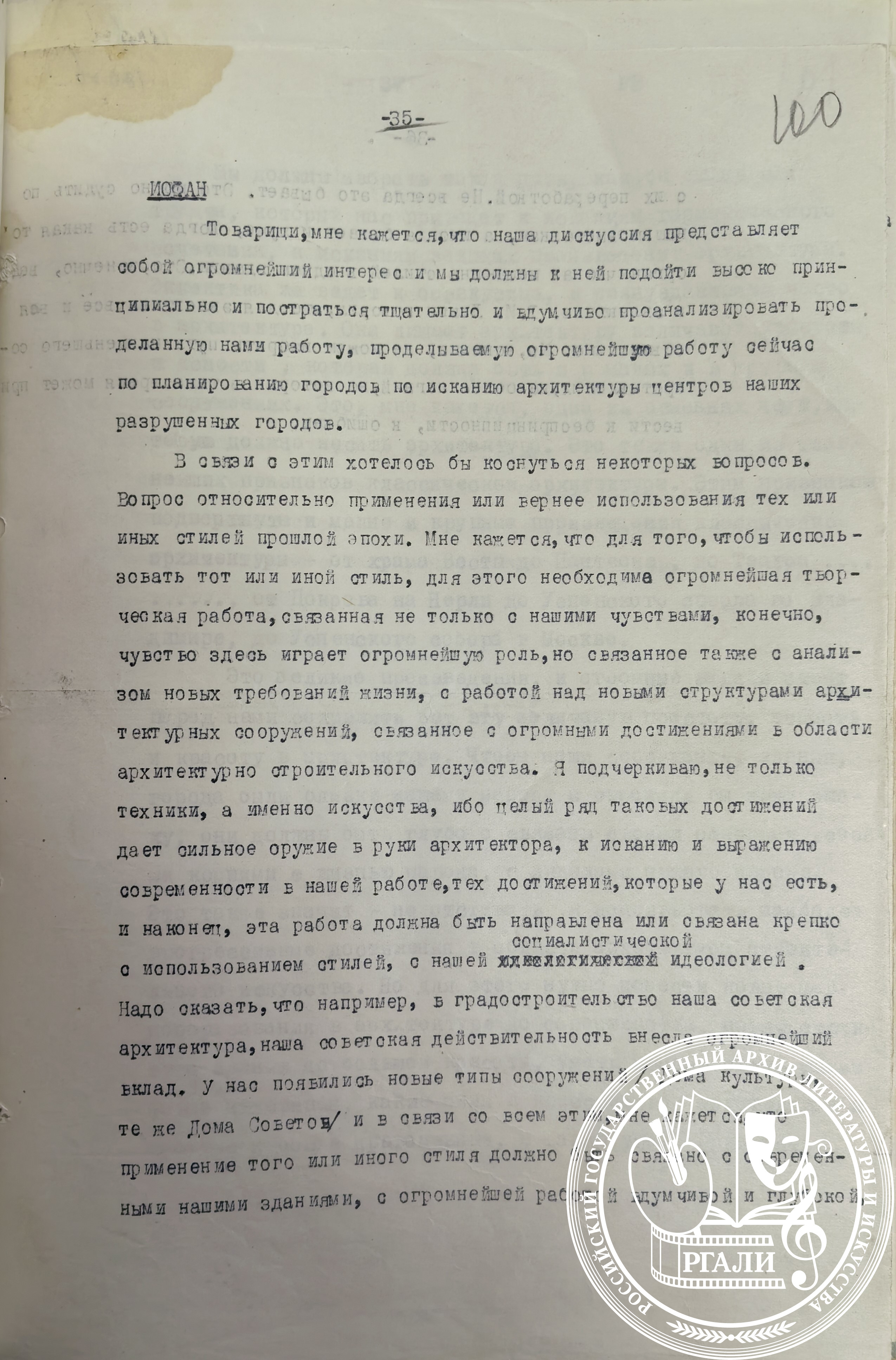 В ходе дискуссии Борис Михайлович Иофан поставил вопрос об использовании стилей прошлой эпохи: «Мне кажется, для того, чтобы использовать тот или иной стиль, для этого необходима огромнейшая творческая работа, связанная не только с нашими чувствами (конечно, чувство здесь играет огромнейшую роль), но связанная также с анализом новых требований жизни, с работой над новыми структурами архитектурных сооружений, связанная с огромными достижениями в области архитектурного строительного искусства» (Ф. 674. Оп. 2).