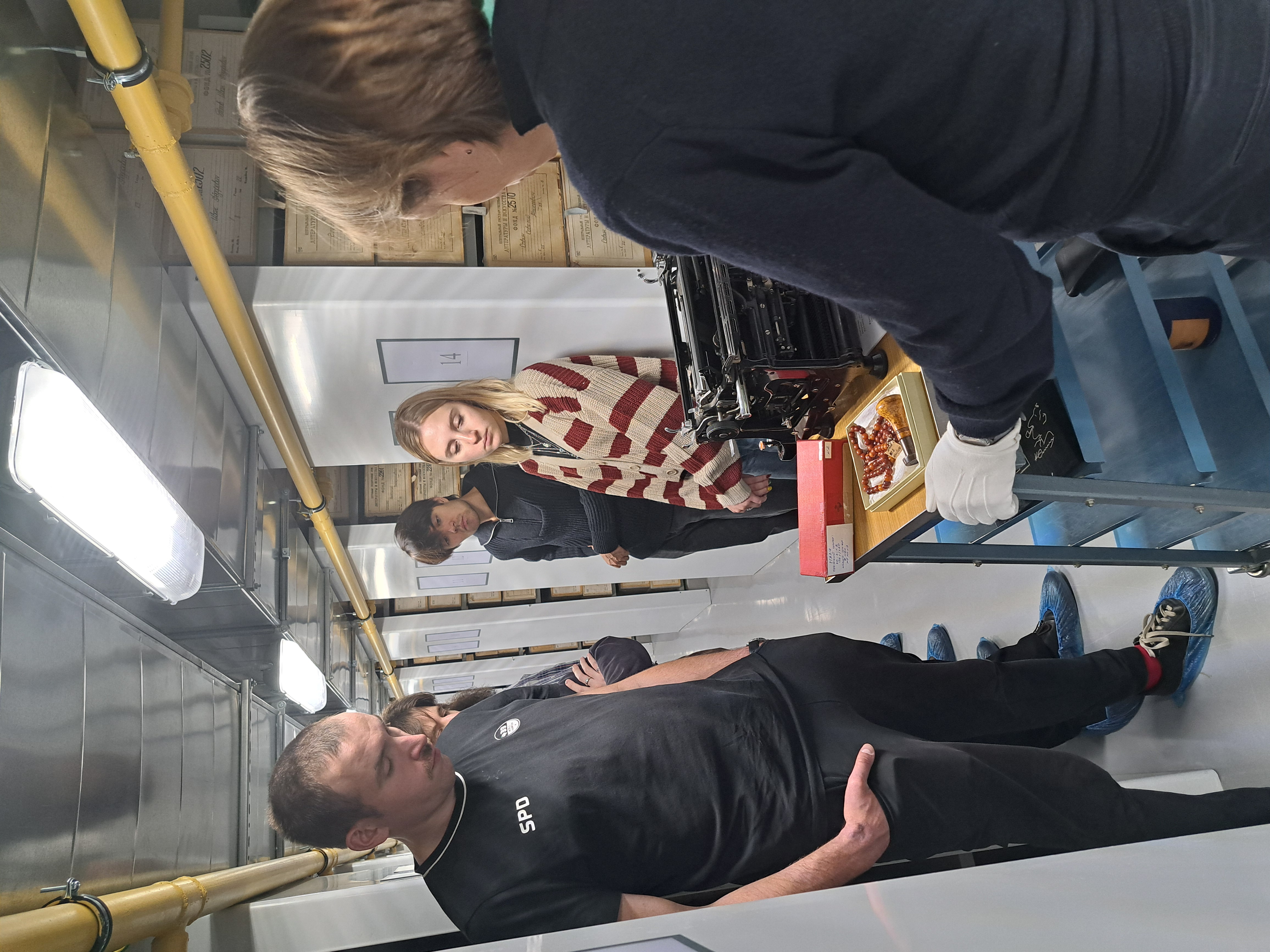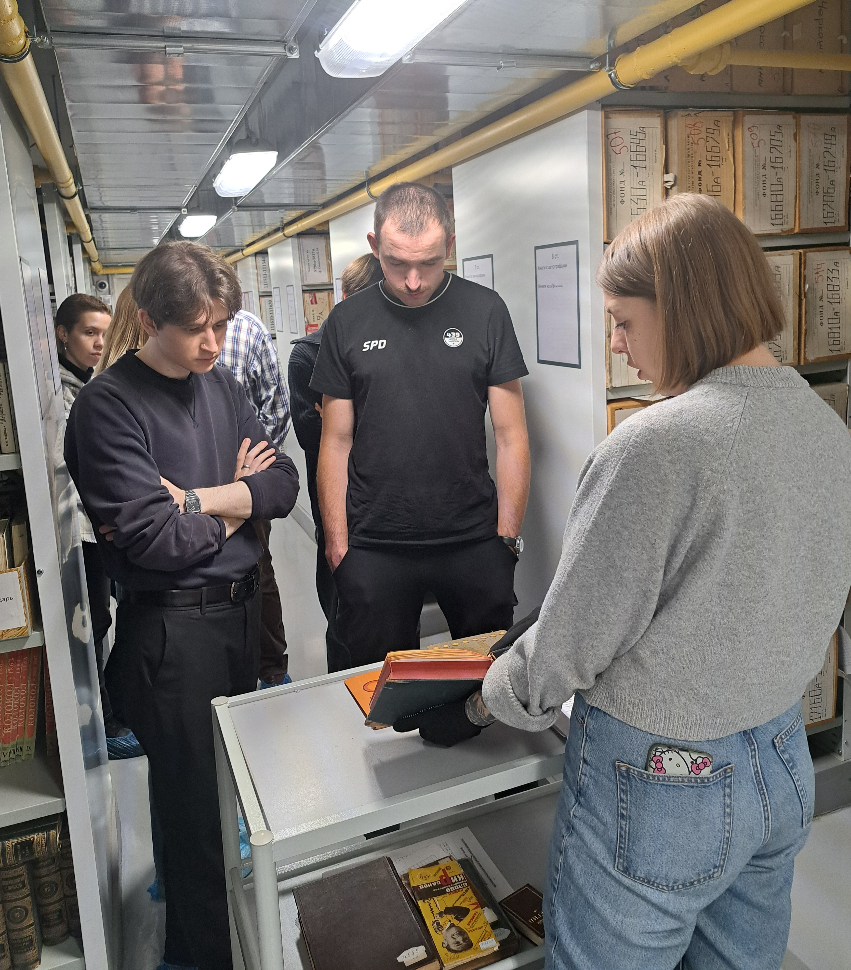 В архивохранилище личных фондов экскурсанты познакомились с коллекцией картин из фондов В.А. Шестакова, К.А. Коровина, В.Е. Татлина и Е.Г. Рубина, а в хранилище печатных изданий главный специалист В.А. Васенкова рассказала о составе коллекций архивохранилища и некоторыми интересными книжными экземплярами.