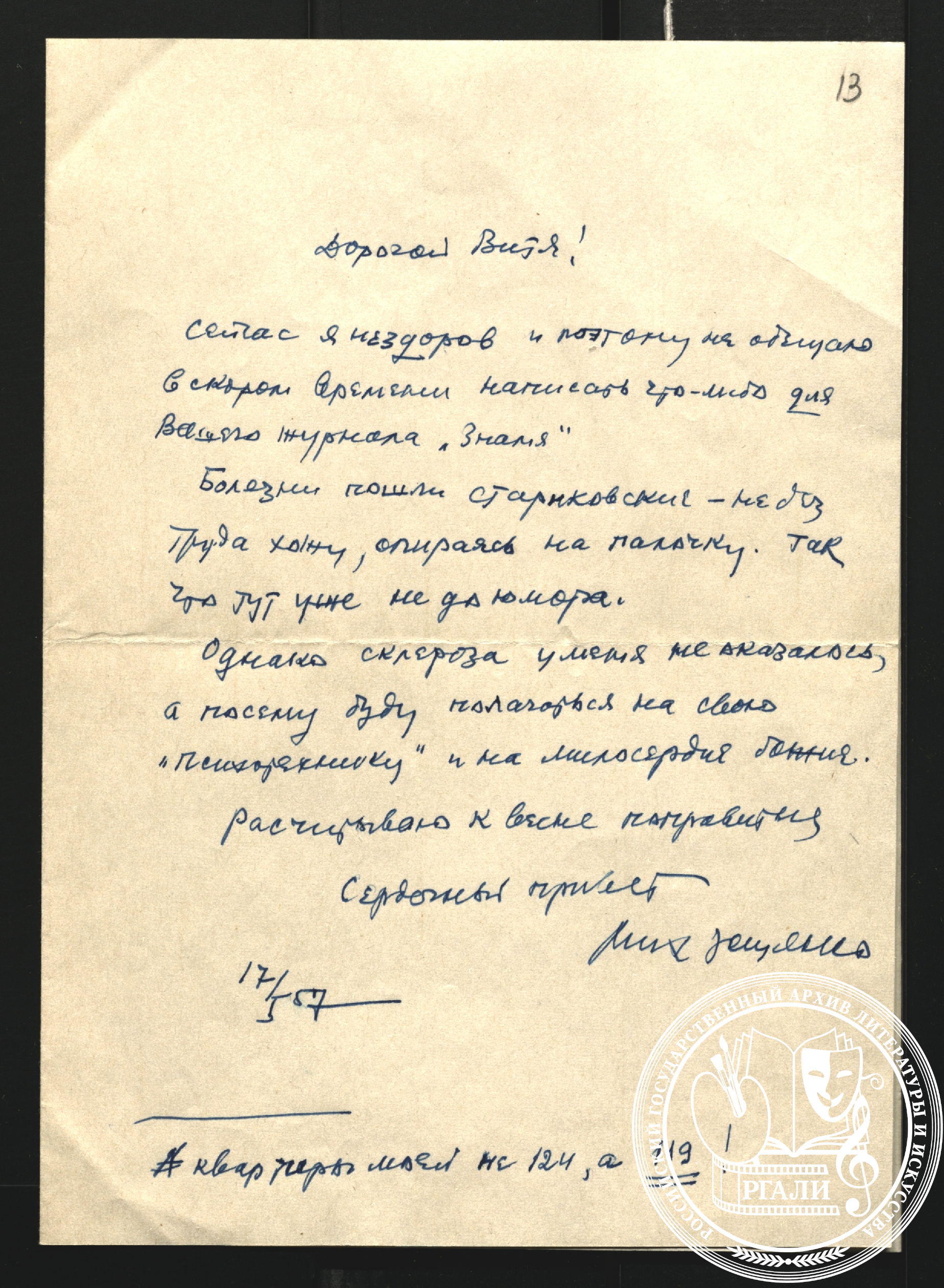 Завершают опись материалы жены В.Е. Ардова — актрисы Нины Антоновны Ольшевской, среди которых хранится письмо А.А. Ахматовой начала 1960-х годов.