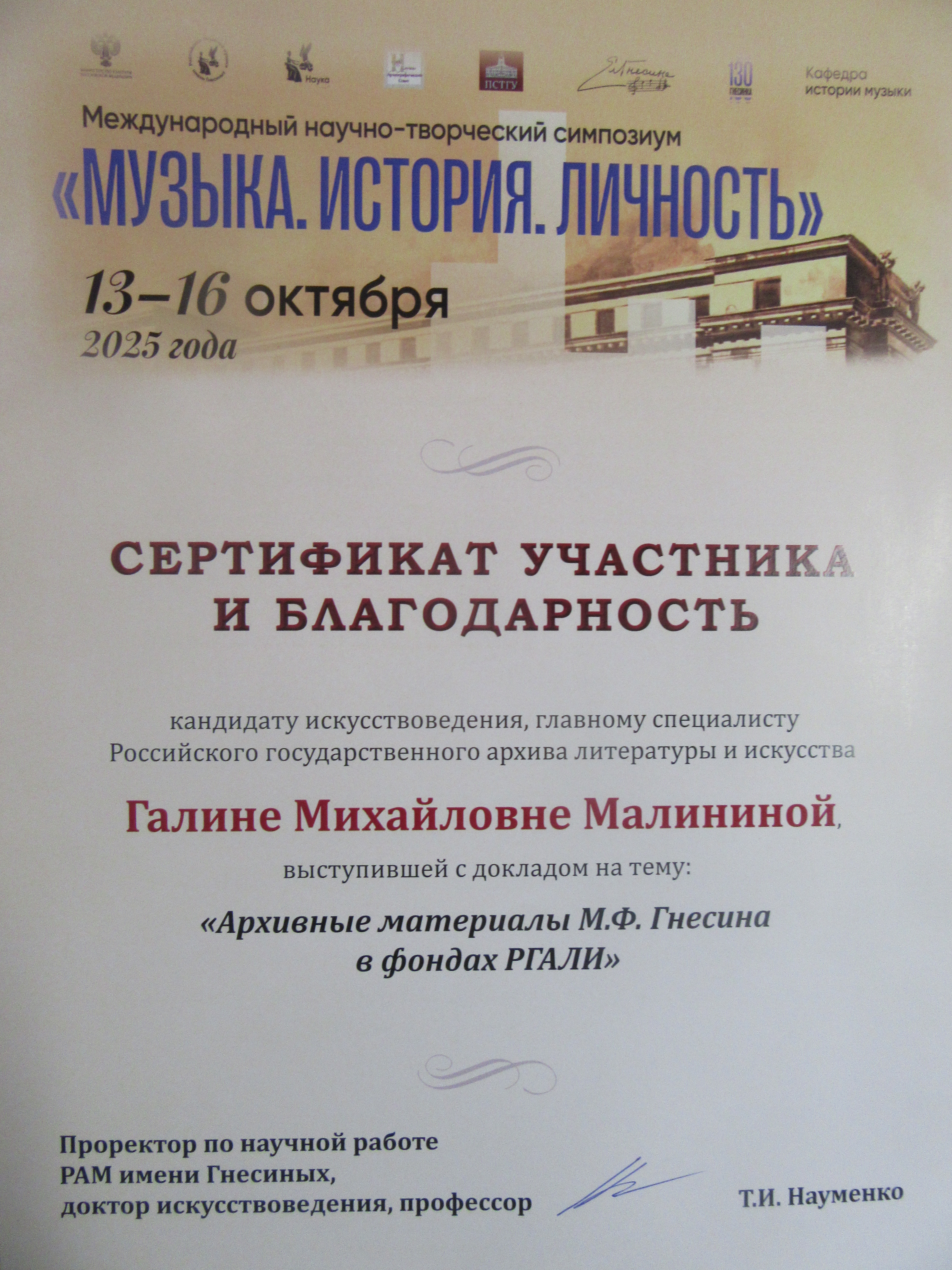 РГАЛИ, хранящий в своих стенах богатейшие уникальные фонды представителей разных видов искусств, направил на Гнесинский симпозиум главного специалиста Г.М. Малинину, подготовившую к настоящему моменту к публикации воспоминания М.Ф. Гнесина о годах его учения в Петербургской консерватории. Фонд М.Ф. Гнесина в РГАЛИ огромен, практически каждый документ в нем — подлинник. Однако до сих пор он не привлекал достойного внимания исследователей, поэтому доклад Г.М. Малининой, включивший в себя ранее неизвестные специалистам материалы архива М.Ф. Гнесина, вызвал живой интерес присутствующих и был выделен организаторами и участниками как эксклюзивный, украсивший работу 1-й секции форума.