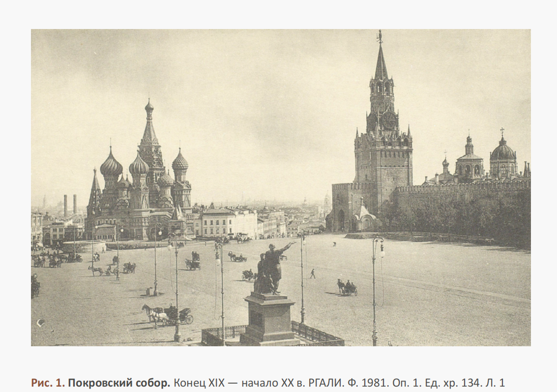 В статье приводятся сведения из дела № 134, хранящемся в фонде архитектора Машкова (Ф. 1981), озаглавленного им «Покровский и Василия Блаженного cобор в Москве». Состав дела неоднороден: протоколы заседаний реставрационных комиссий 1919–1920-х годов; программа работ на 1919–1920 годы по ремонту храма Василия Блаженного; предварительная смета на реставрационные работы 1921 года; выписки из дела Московского архитектурного общества (1877–1904); записка, составленная художником Аполлинарием Васнецовым и другие документы. В архивном деле также находятся чертежи и фотография собора.