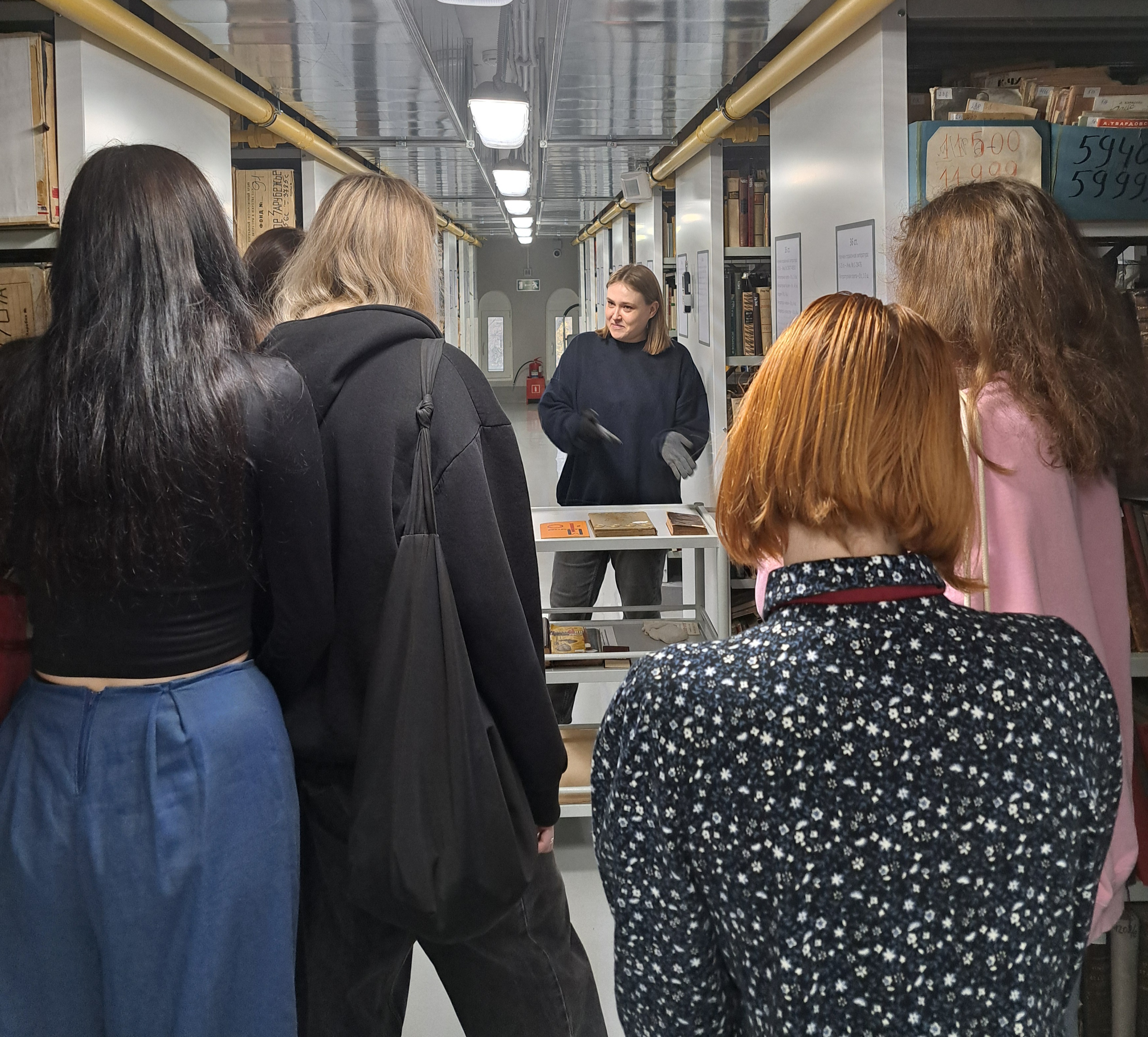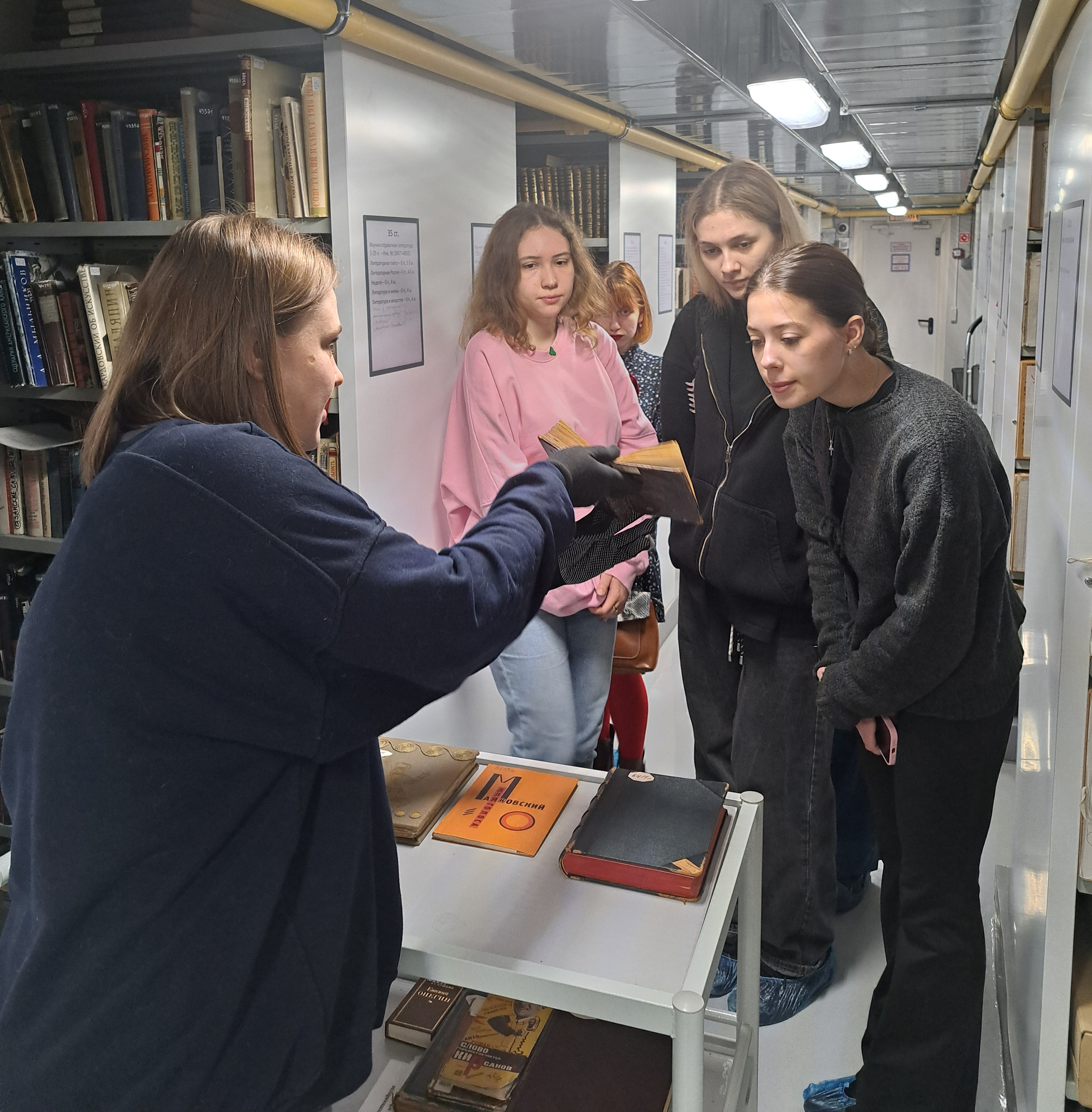 В хранилище печатных изданий посетителям рассказали о составе коллекций архивохранилища и некоторыми интересными книжными экземплярами — грамматикой начала XVIII века, примерами книжного авангарда, изданиями из личных собраний фондообразователей архива, такими как том рассказов А.М. Ремизова с его автографом на глаголице.