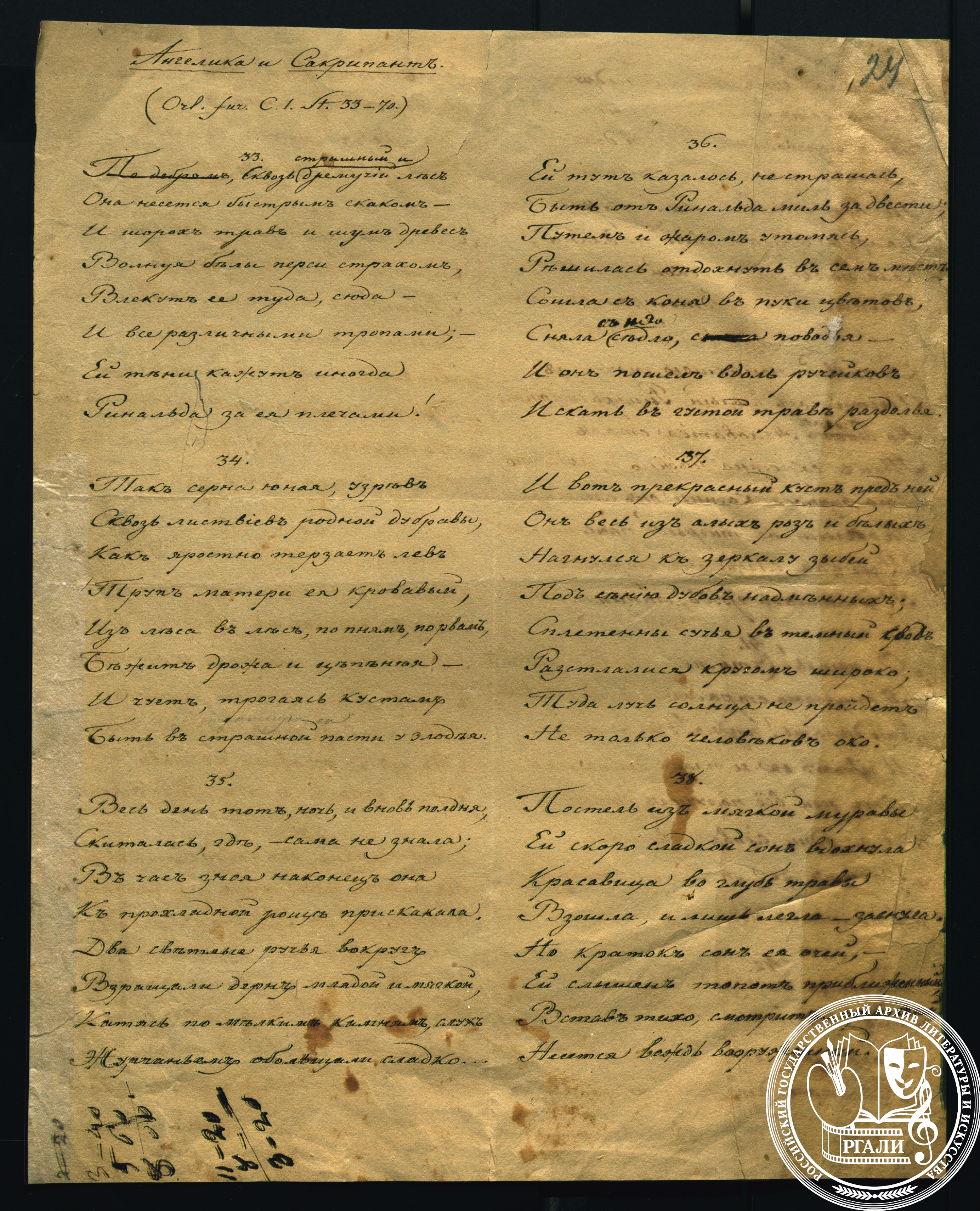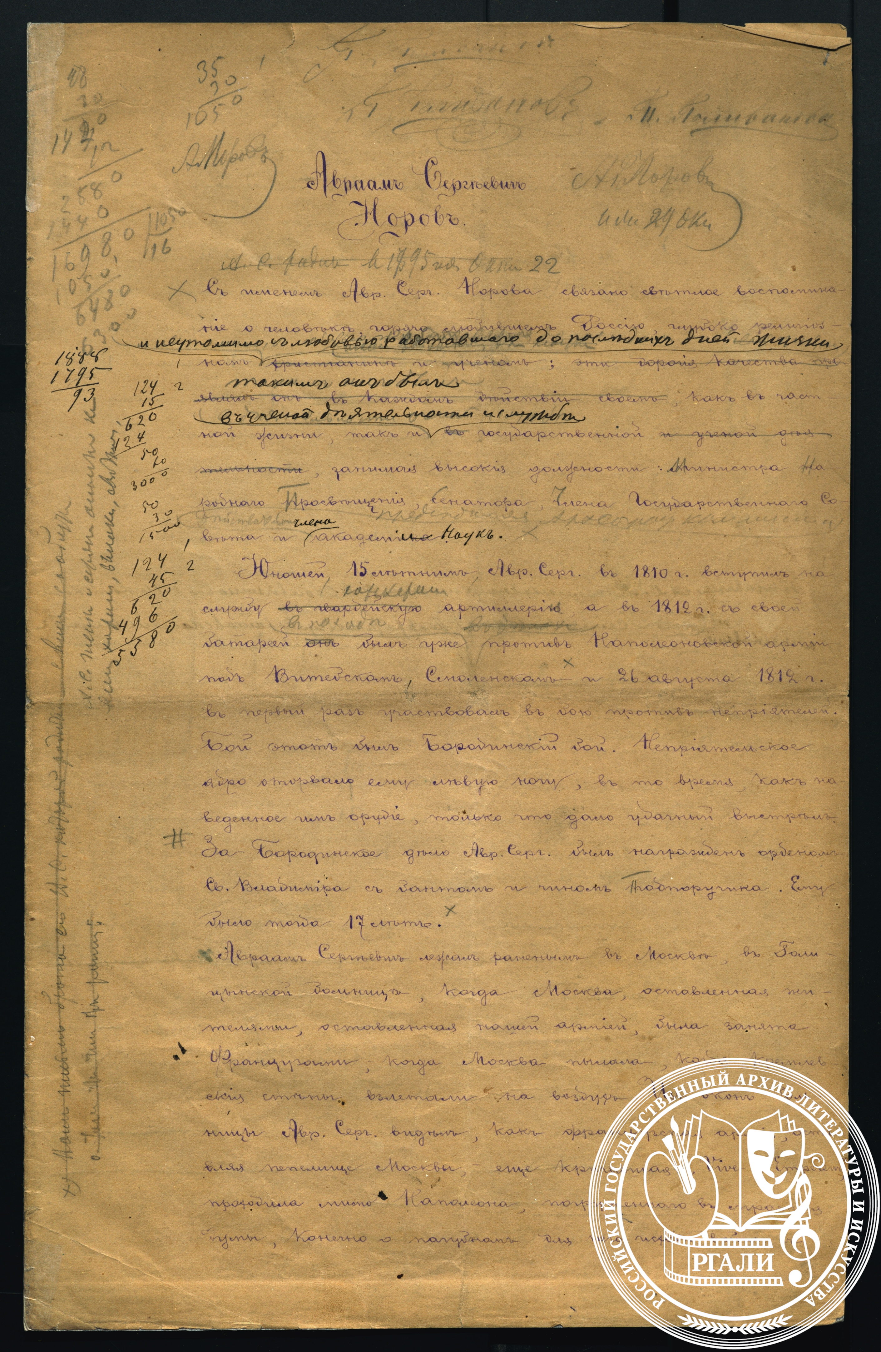 Материалы путешествий А.С. Норова также представлены в РГАЛИ. Среди них самыми объемными являются разрозненные путевые записи о посещении Палестины и Синая, где Авраам Сергеевич довольно полно фиксирует свои передвижения и впечатления (Ф. 349. Оп. 1. Ед. хр. 39). Интерес вызывает и небольшое собрание документов, полученных или купленных Норовым во время его пребывания на Востоке (Ф. 349 Оп. 1 Ед. хр. 6): копия охранной грамоты, выданной Наполеоном Синайскому монастырю, список странноприимных домов в Сирии и Палестине и других, свидетельствующих о глубоком и тщательном подходе к исследованию истории и географии стран пребывания.
