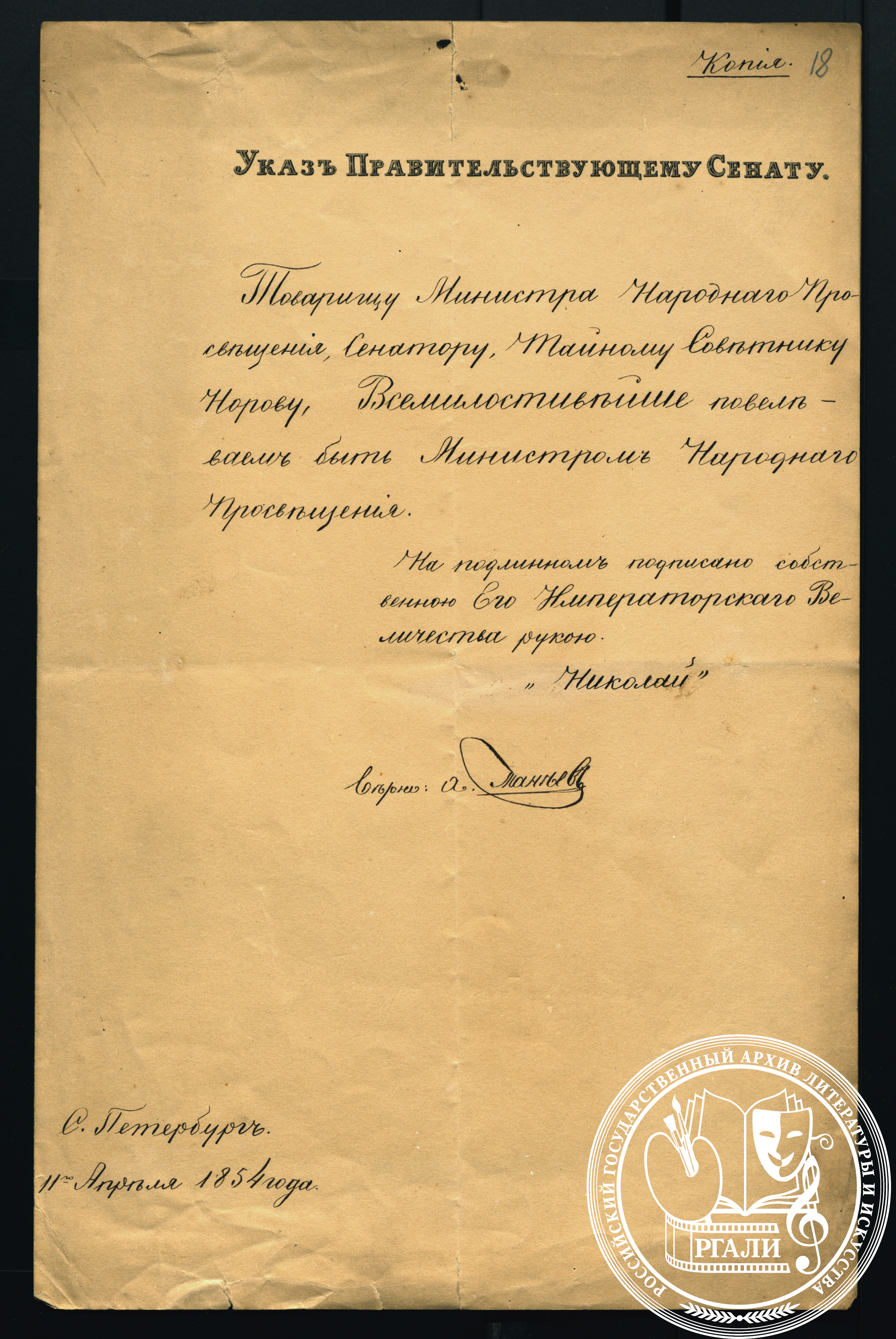 Увы, здравые и порой консервативные взгляды Авраама Сергеевича в новую эпоху Александра II стали причиной его отставки в 1858 году. Такому обороту событий способствовала также стычка студентов Московского университета с полицией 30 сентября 1857 года, информацию о которой можно найти в нескольких документах РГАЛИ (Ф. 195. Оп. 1. Ед. хр. 2424; Ф. 349. Оп. 1. Ед. хр. 26). Хотя безымянный автор биографии Норова писал, что «одного лишь его присутствия или даже письма было достаточно, чтобы остановить всякий беспорядок» (РГАЛИ Ф. 349. Оп. 1. Ед. хр. 2), Авраам Сергеевич не увидел в этом выступлении молодежи политической подоплеки, а считал, что студентам на манер средневековых вагантов было просто необходимо «выпустить пар». Увы, такой подход не нашел понимания у высшей власти; конфликт привел к арестам, ужесточению университетского надзора и потере А.С. Норовым должности.