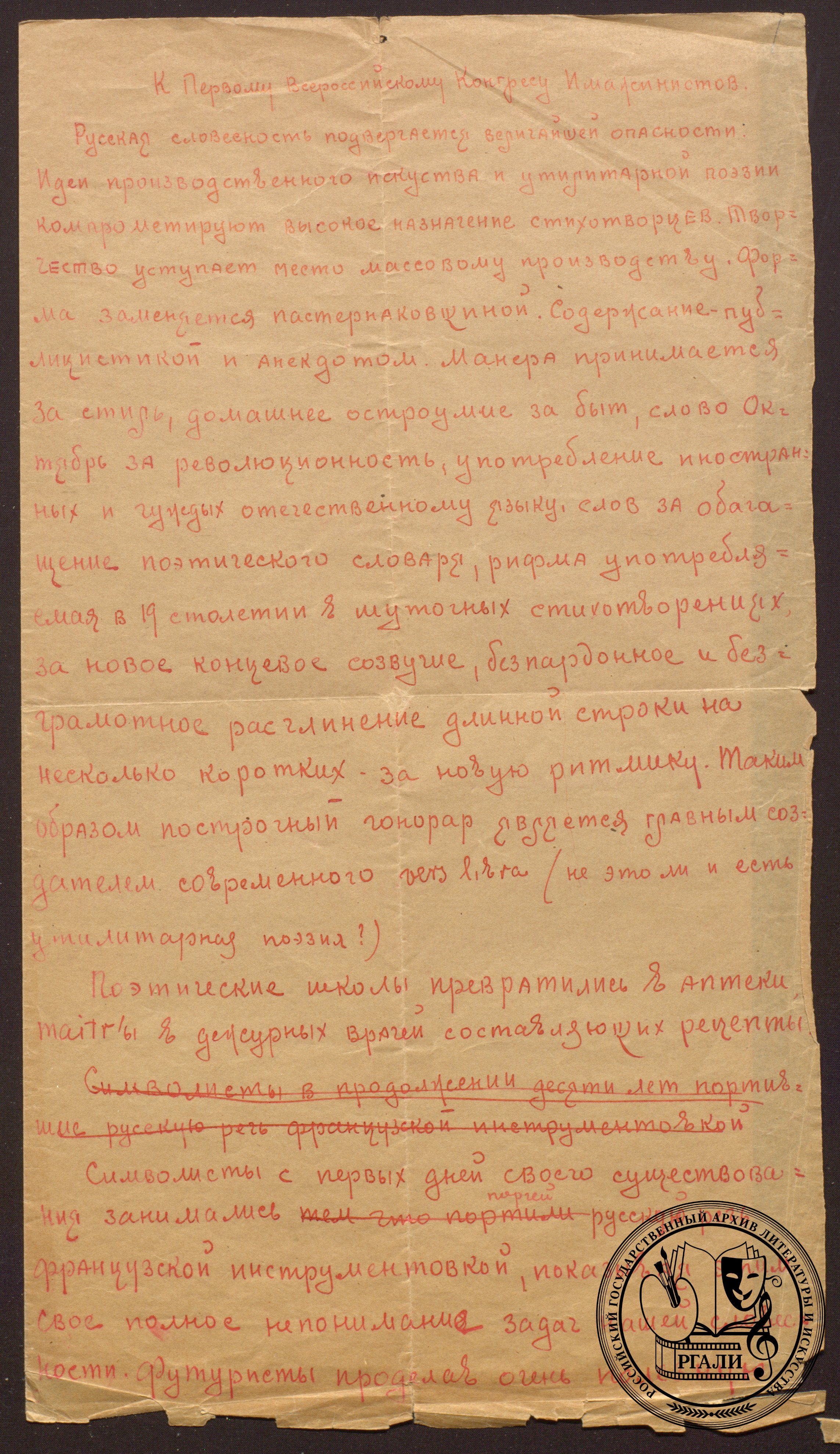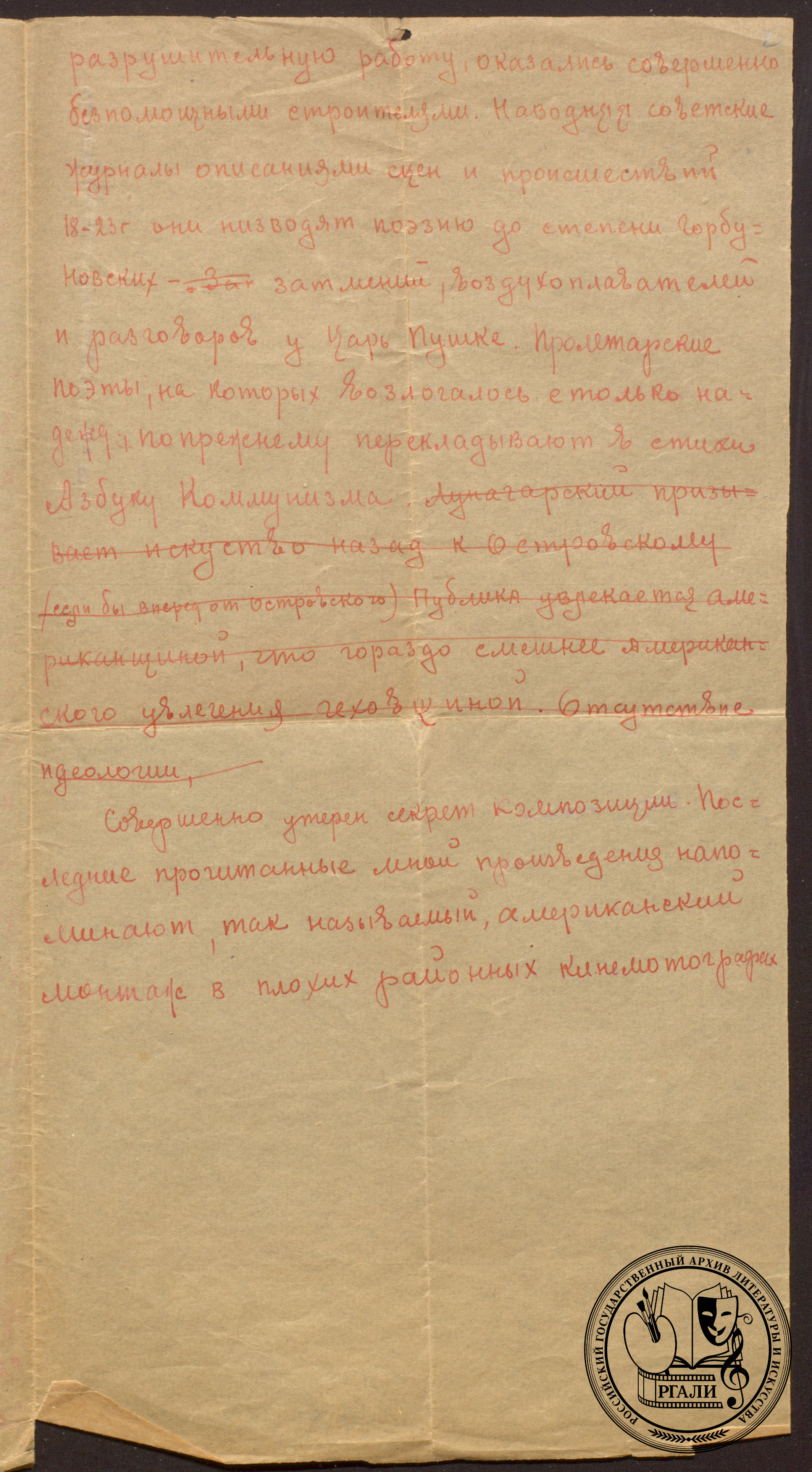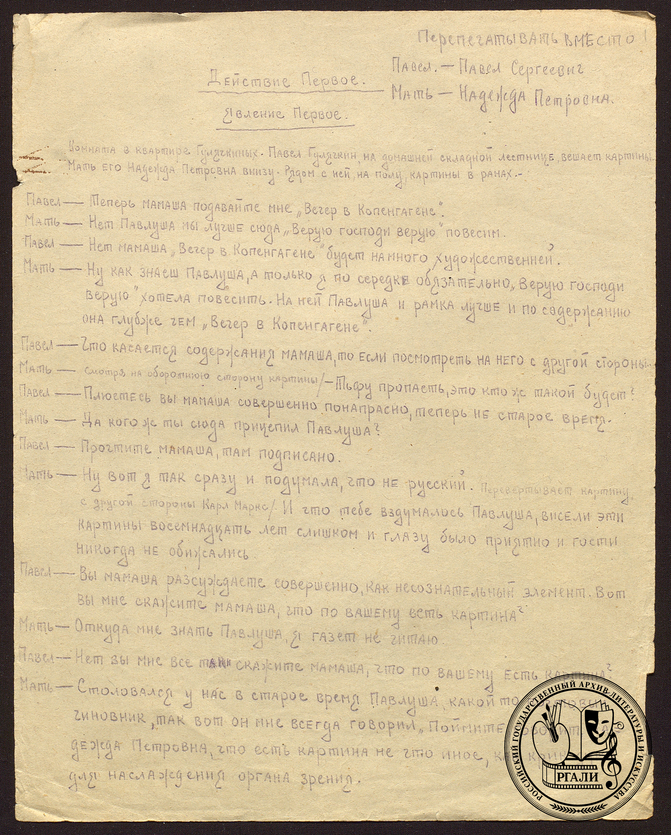 В личном фонде Н.Р. Эрдмана (Ф. 2570. Оп. 1‒2; 272 ед. хр. за 1899‒1970 гг.), архив которого был передан в РГАЛИ в 1970-х годах родственниками И.И. Кирпичниковой, Н.В. Чидсон и А.Н. Яковлевым, литературное наследие драматурга представлено лишь частично. Однако здесь прослеживаются все жанры, в которых он работал, и главное – сохранились рукописи знаменитых пьес «Мандат» и «Самоубийца». Сегодня можно свободно ознакомиться с автографами его басен, скетчей, миниатюр, интермедий, обозрений, сценариев художественных и мультипликационных фильмов.