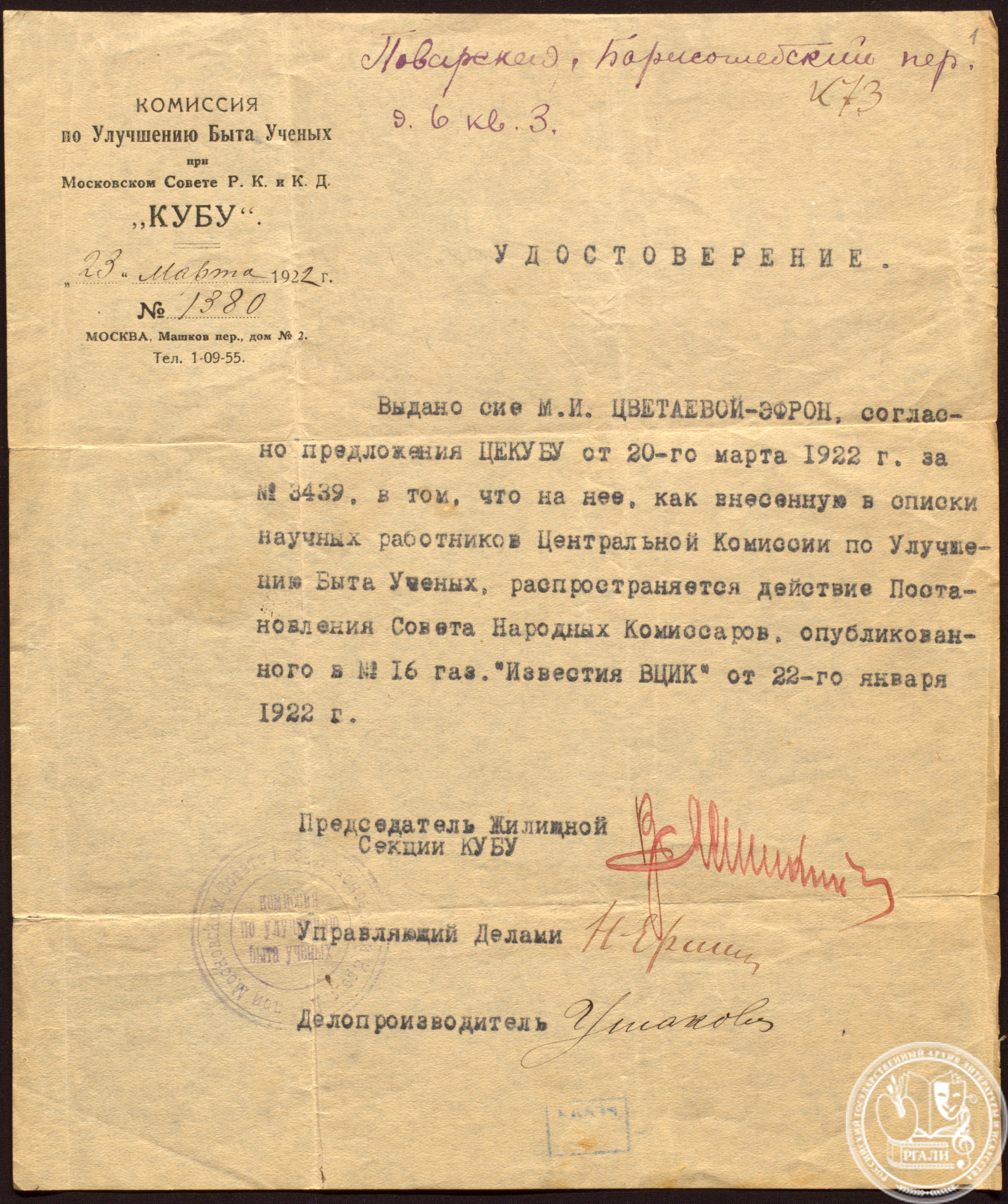 На выставке представлены предметы быта, образцы личных и официальных документов, агитационных материалов и прессы, среди которых копии шести документов из личных фондов М.И. Цветаевой (Ф. 1190), Г.А. Шенгели (Ф. 2861) и Б.Е. Захавы (Ф. 3034).