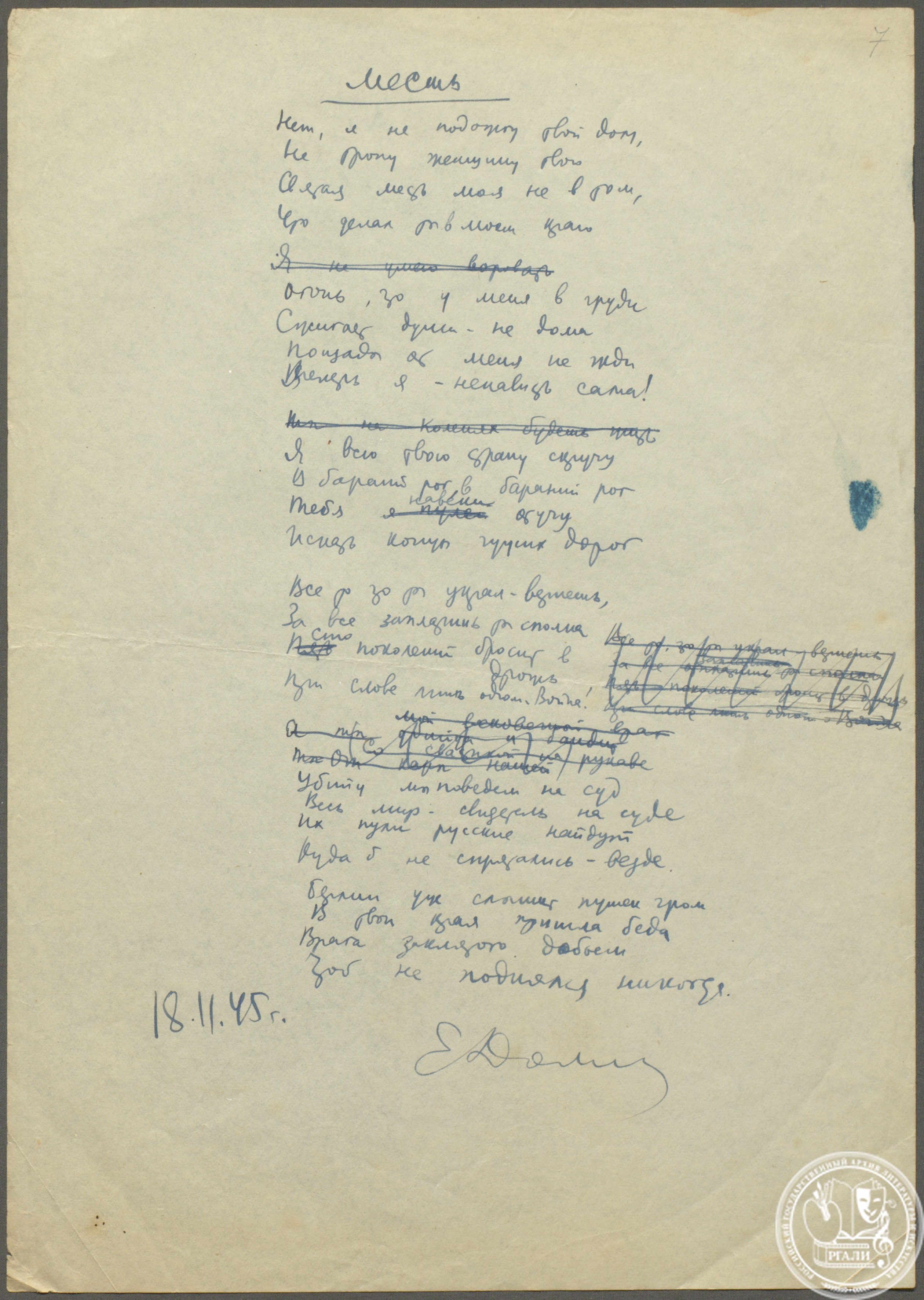 РГАЛИ передал для выставки 7 подлинных документов. Среди них автографы стихотворений Е.А. Долматовского (Ф. 1864) «Берлинское шоссе», «Месть», «Командарм», «Надпись на Рейхстаге» и стихотворения М.В. Исаковского (Ф. 1373) «Враги сожгли родную хату», записные книжки Д.С. Самойлова (Ф. 1465) и С.П. Гудзенко (Ф. 2207), а также детская продуктовая карточка для немцев, проживавших на территории советской зоны оккупации из фонда А.П. Штейна (Ф. 3141). В копии экспонируется стихотворение А.И. Фатьянова (Ф. 2508) «Давно мы дома не были».