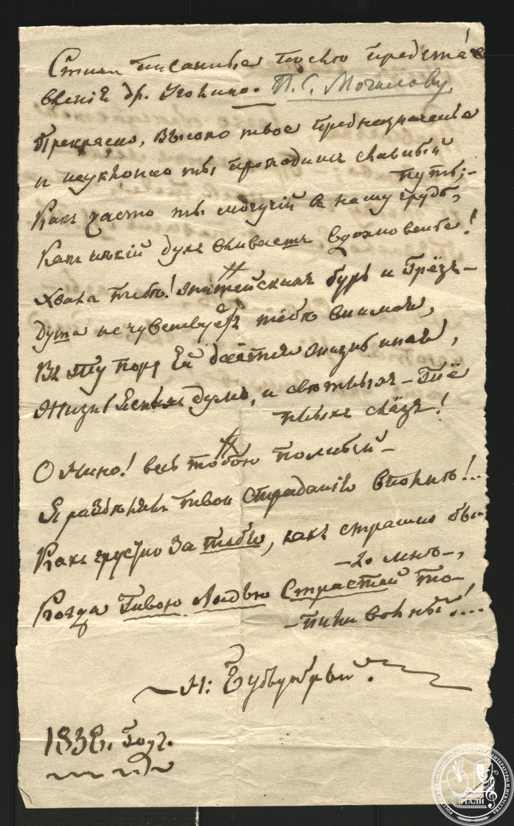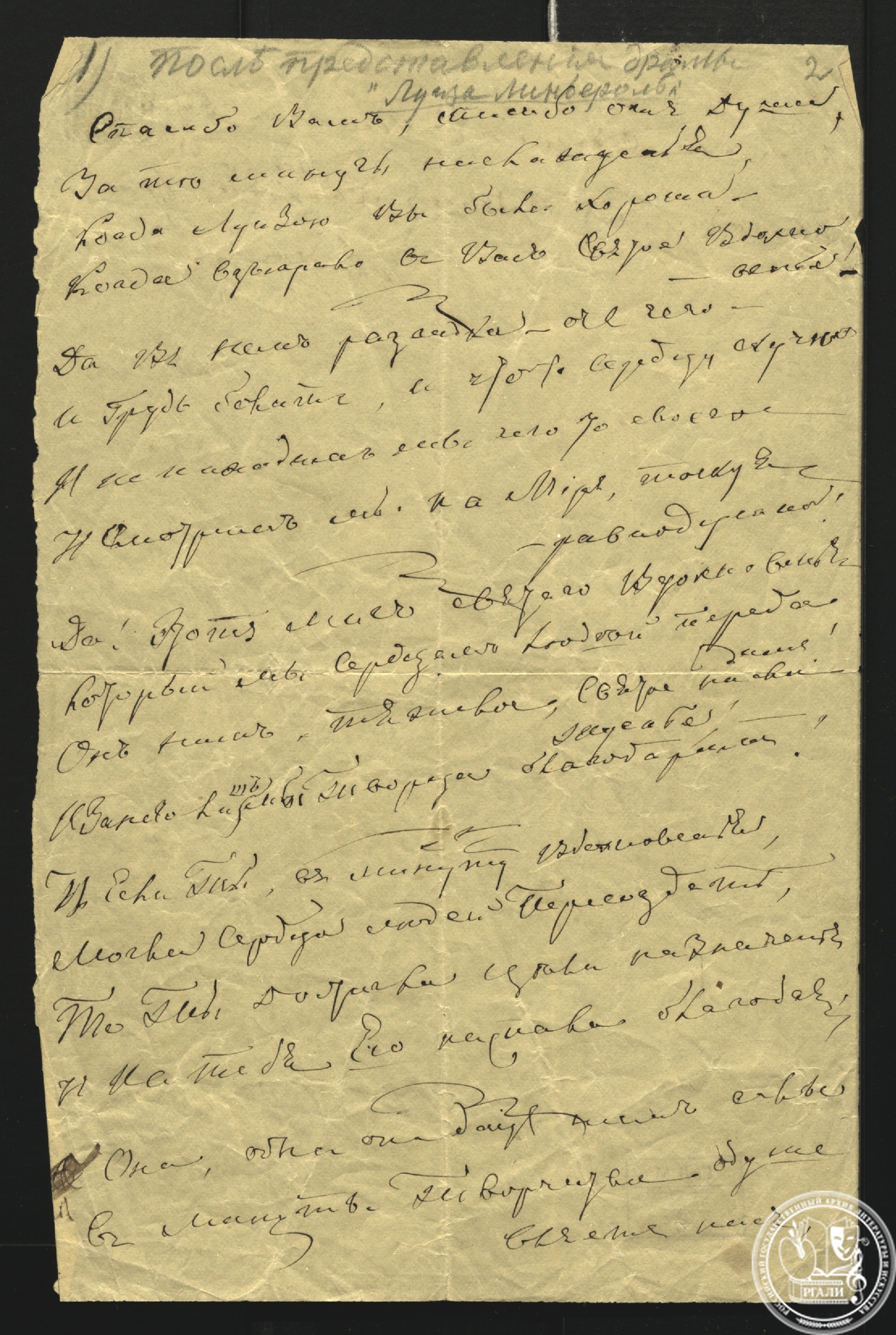 С 1824 года П.С. Мочалов – актер Малого театра. Именно в его исполнении публика впервые увидела Чацкого в пьесе «Горе от ума» А.С. Грибоедова, Павел Степанович первым открыл русской сцене трагедии У. Шекспира и Ф. Шиллера. А еще он представил на сцене театра свою собственную драму «Черкешенка», сыграв в 1840 году роль Джембулата.