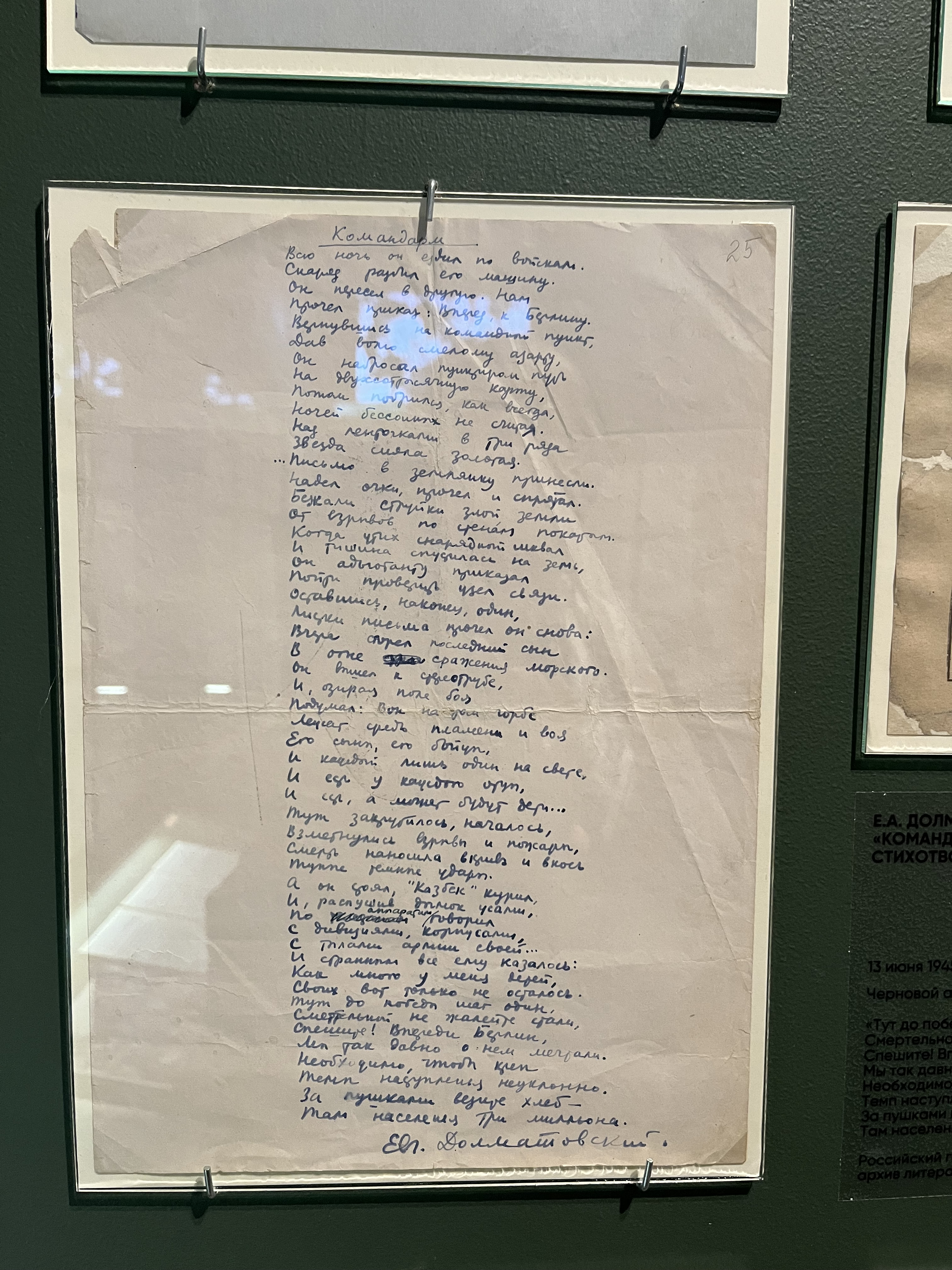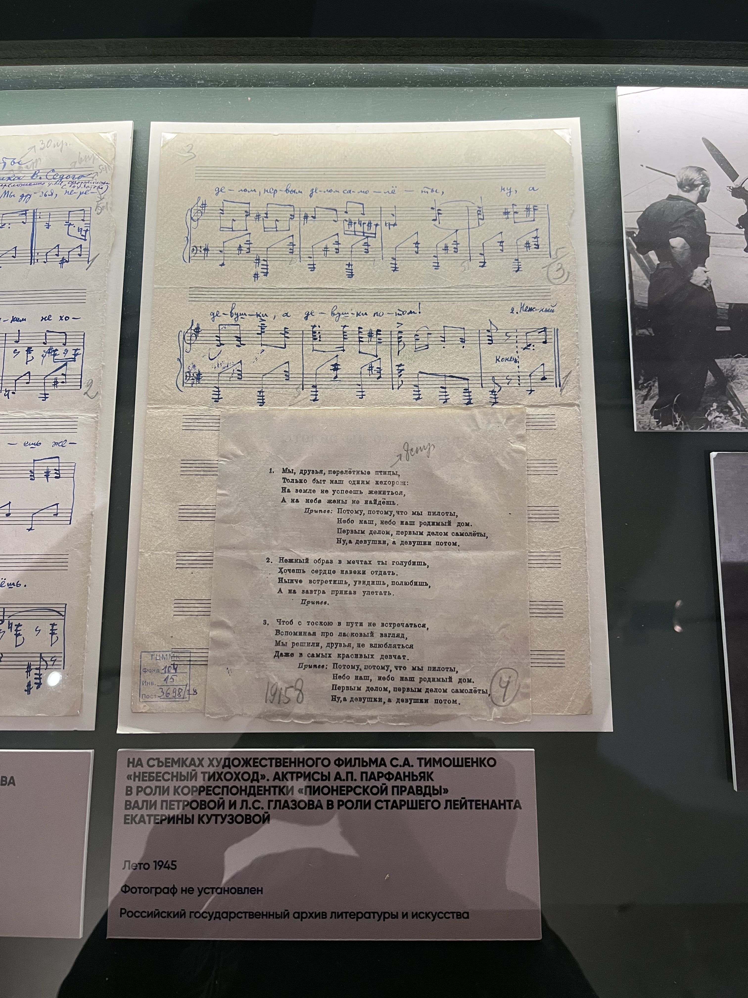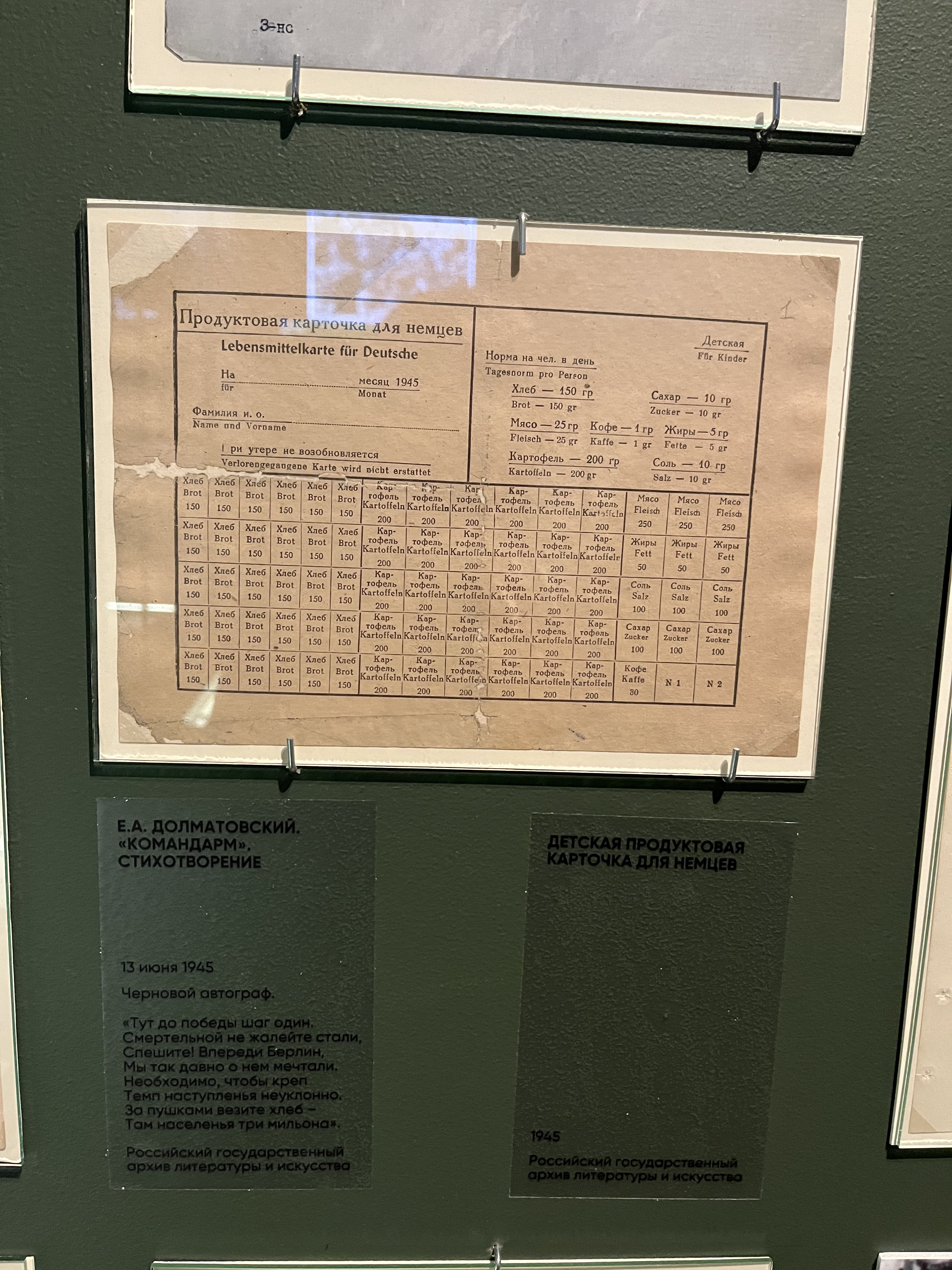 Российский государственный архив литературы и искусства предоставил для выставки 7 подлинных документов. Среди них автографы стихотворений Е.А. Долматовского (Ф. 1864) «Берлинское шоссе», «Месть», «Командарм», «Надпись на Рейхстаге» и стихотворения М.В. Исаковского (Ф. 1373) «Враги сожгли родную хату», записные книжки Д.С. Самойлова (Ф. 1465) и С.П. Гудзенко (Ф. 2207), а также детская продуктовая карточка для немцев, проживавших на территории советской зоны оккупации из фонда А.П. Штейна (Ф. 3141). В копии экспонируется стихотворение А.И. Фатьянова (Ф. 2508) «Давно мы дома не были».