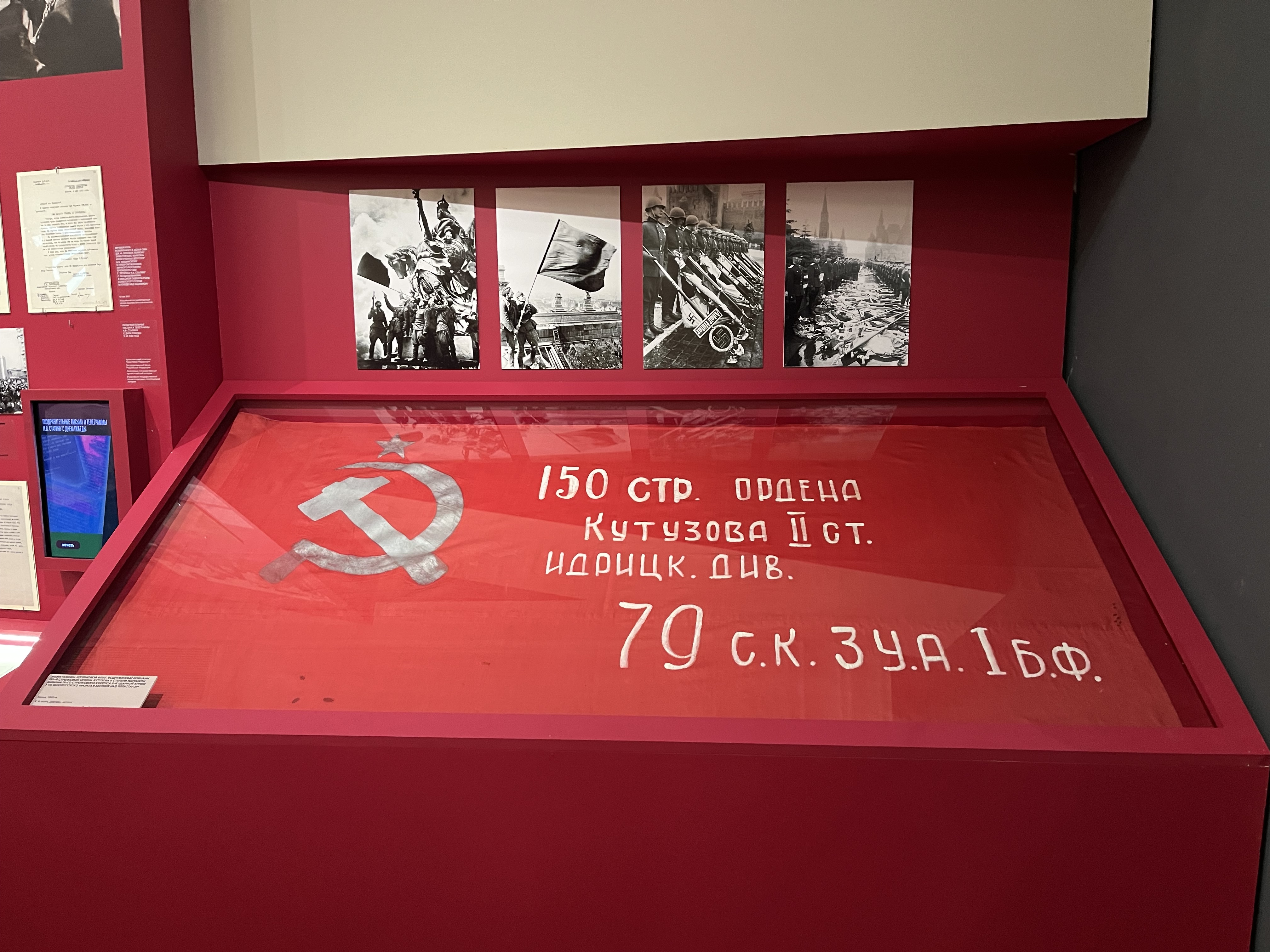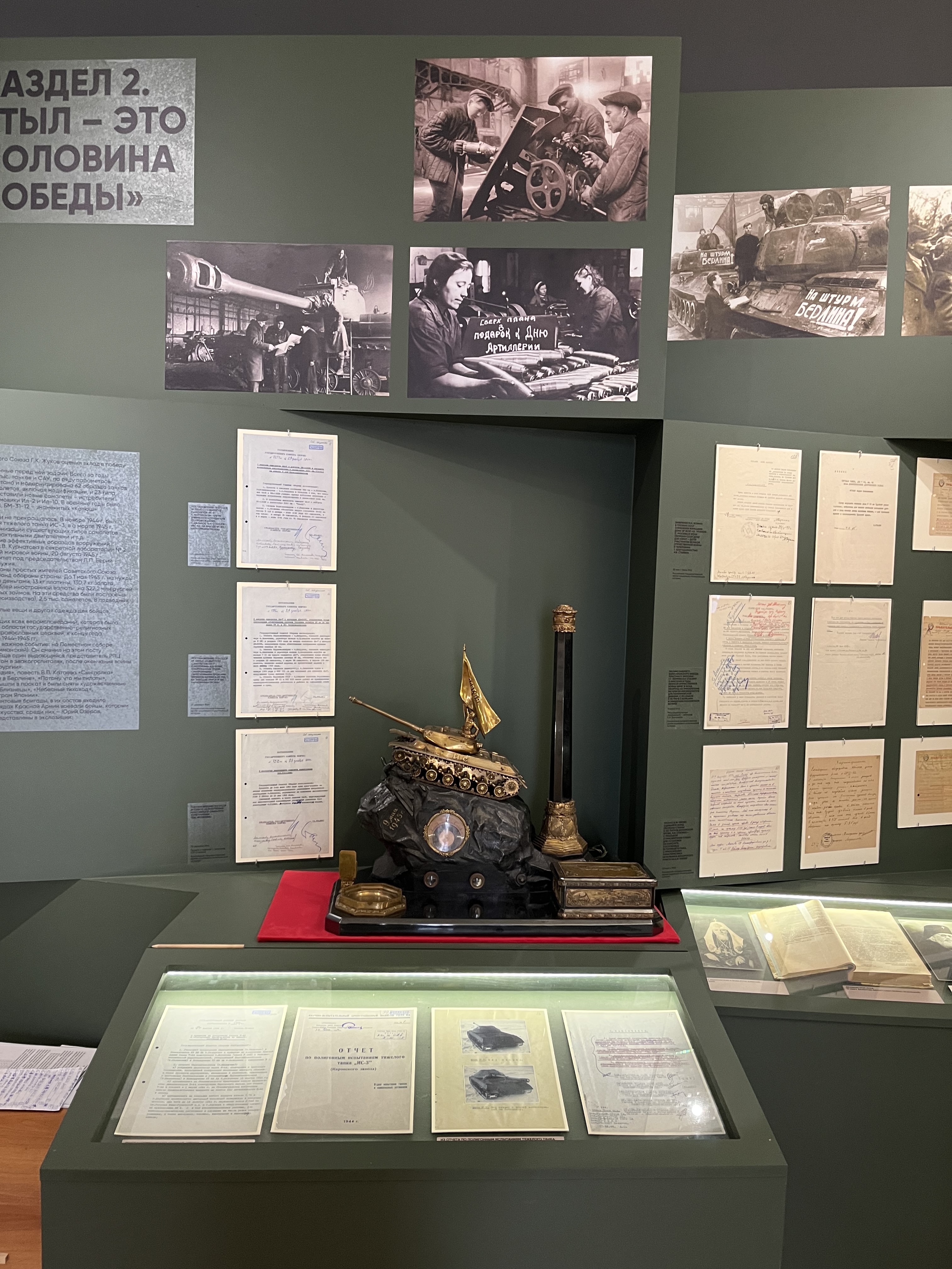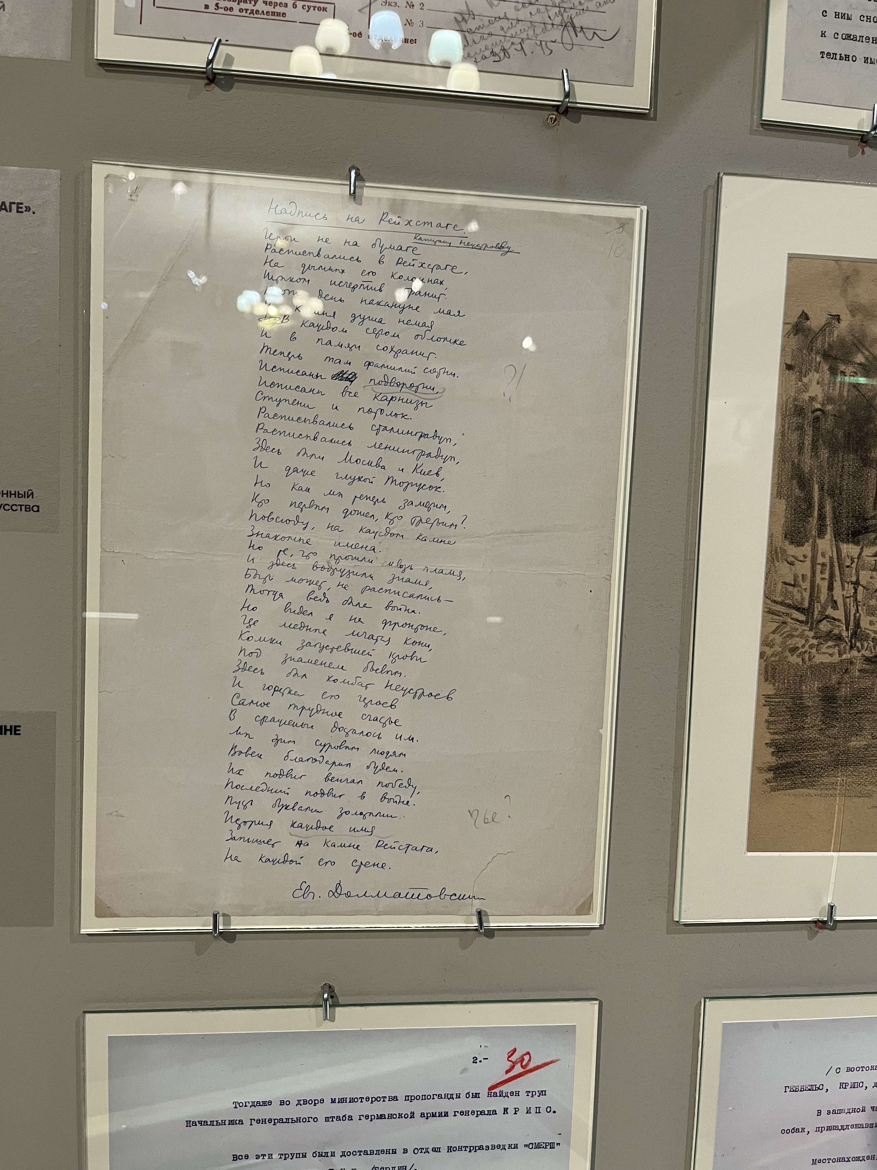 Российский государственный архив литературы и искусства предоставил для выставки 7 подлинных документов. Среди них автографы стихотворений Е.А. Долматовского (Ф. 1864) «Берлинское шоссе», «Месть», «Командарм», «Надпись на Рейхстаге» и стихотворения М.В. Исаковского (Ф. 1373) «Враги сожгли родную хату», записные книжки Д.С. Самойлова (Ф. 1465) и С.П. Гудзенко (Ф. 2207), а также детская продуктовая карточка для немцев, проживавших на территории советской зоны оккупации из фонда А.П. Штейна (Ф. 3141). В копии экспонируется стихотворение А.И. Фатьянова (Ф. 2508) «Давно мы дома не были».