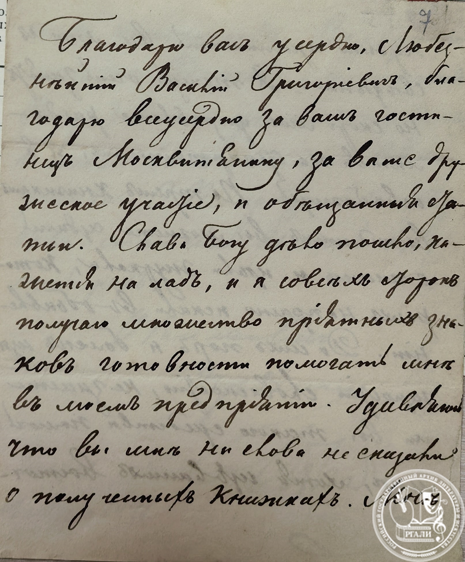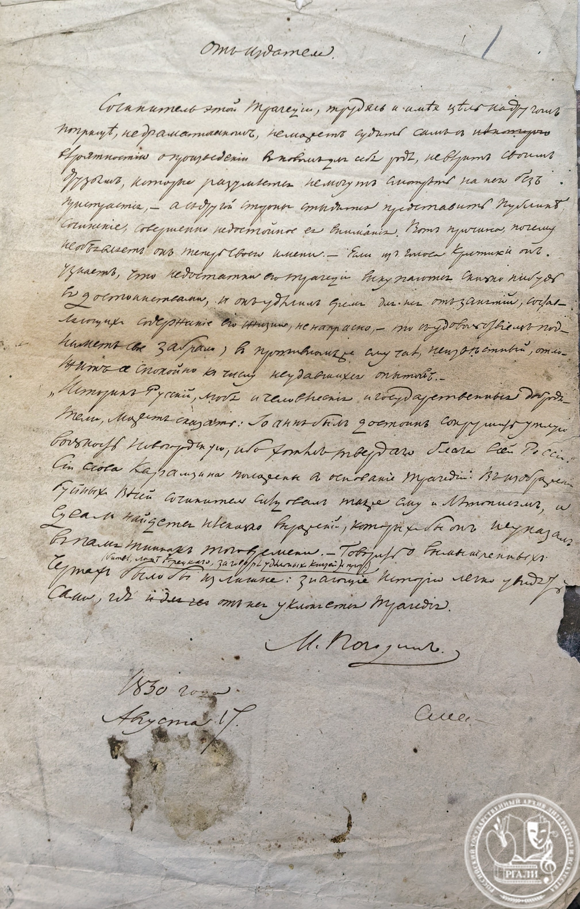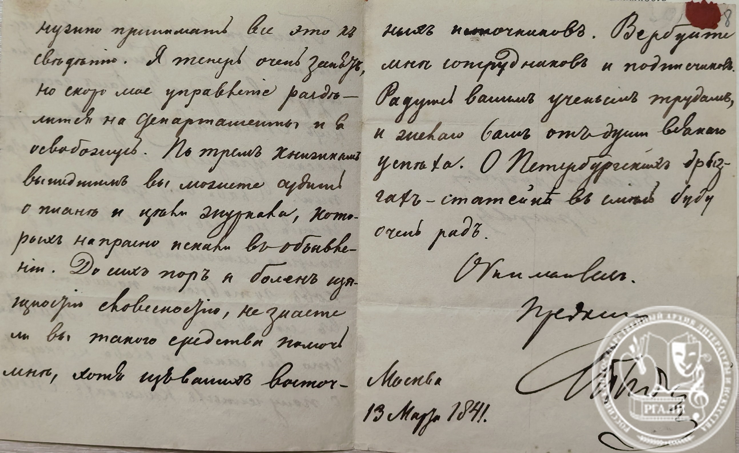 Кроме коллекционирования, у Погодина было еще одно пристрастие – журналистика. Он стал редактором и издателем основанного им в 1841 году журнала «Москвитянин». В одном из писем, отправленных в марте 1841 года В.Г. Григорьеву, говорится: «...слава Богу, дело пошло, кажется, на лад, и я со всех сторон получаю множество приятных знаков готовности помогать мне в моем предприятии. ...До сих пор я болен изящной словесностью, не знаете ли Вы такого средства помочь мне, хоть из Ваших восточных источников. Вербуйте мне сотрудников и подписчиков» (Ф. 373. Оп. 3).