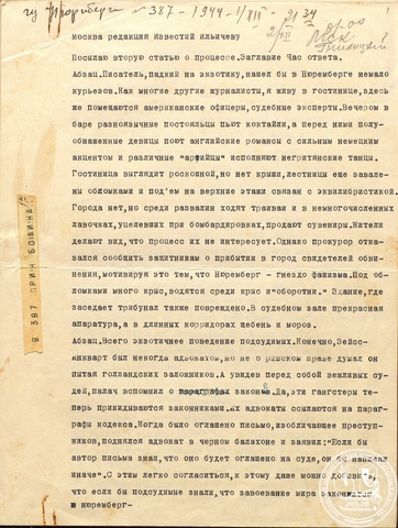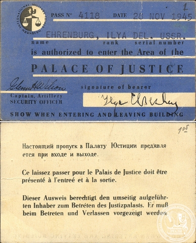 С пропуском оказалось сложнее. Эренбург пригрозил, что немедленно уедет из Нюрнберга, и тогда все узнают, что его «не пустили на процесс гитлеровских разбойников». «Я старательно перевожу эту тираду очередному американскому майору, – вспоминал Ефимов, – на которого она не производит ни малейшего впечатления. Он невозмутимо повторяет, что лимит пропусков на советскую делегацию исчерпан, и он ничем не может помочь. …Кончается это тем, что Эренбург берет мой пропуск и преспокойно проходит в зал суда». В конце концов, 28 ноября 1945-го писатель все же получил собственный пропуск на процесс за номером 4118, который сохранился до наших дней в его личном фонде в РГАЛИ.